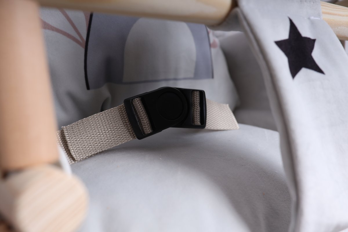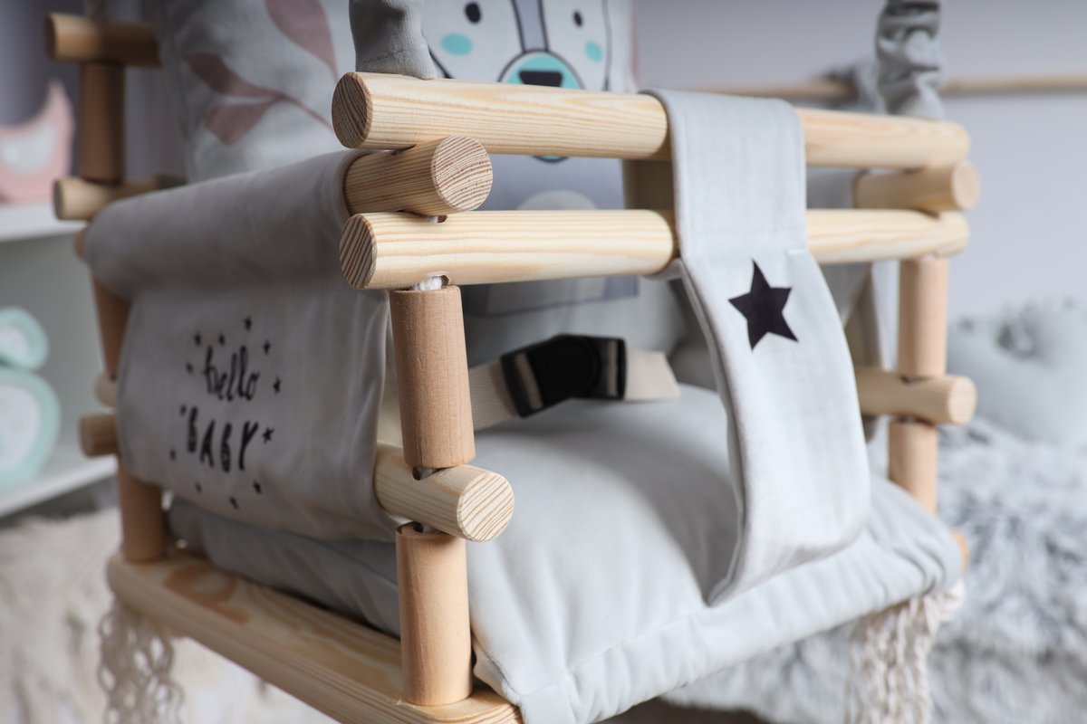 Huśtawka wykonana z delikatnego aksamitno pluszowego materiału,który jest bardzo miękki i delikatny w dotyku oraz bardzo wytrzymały.