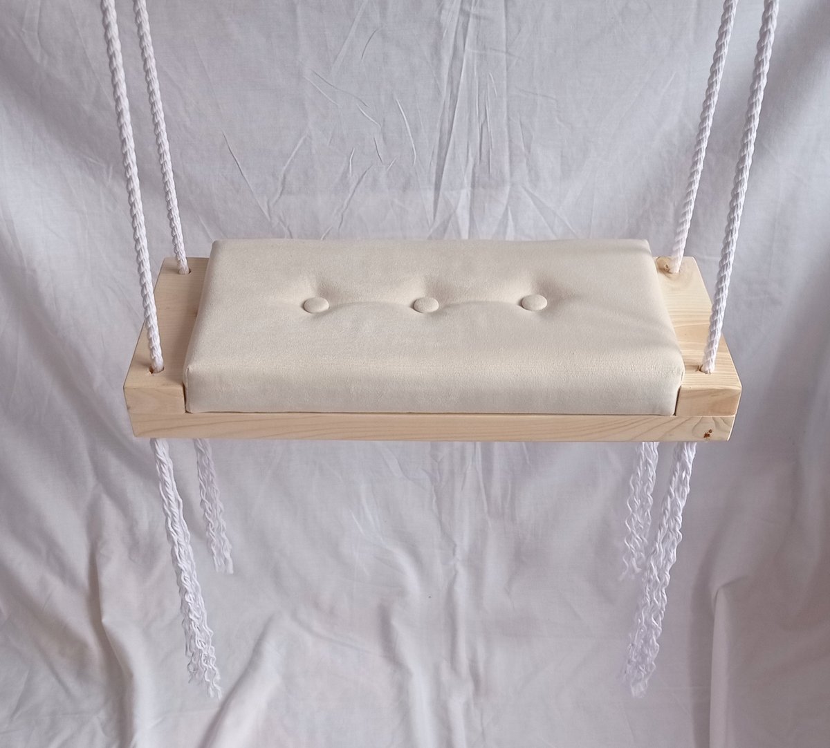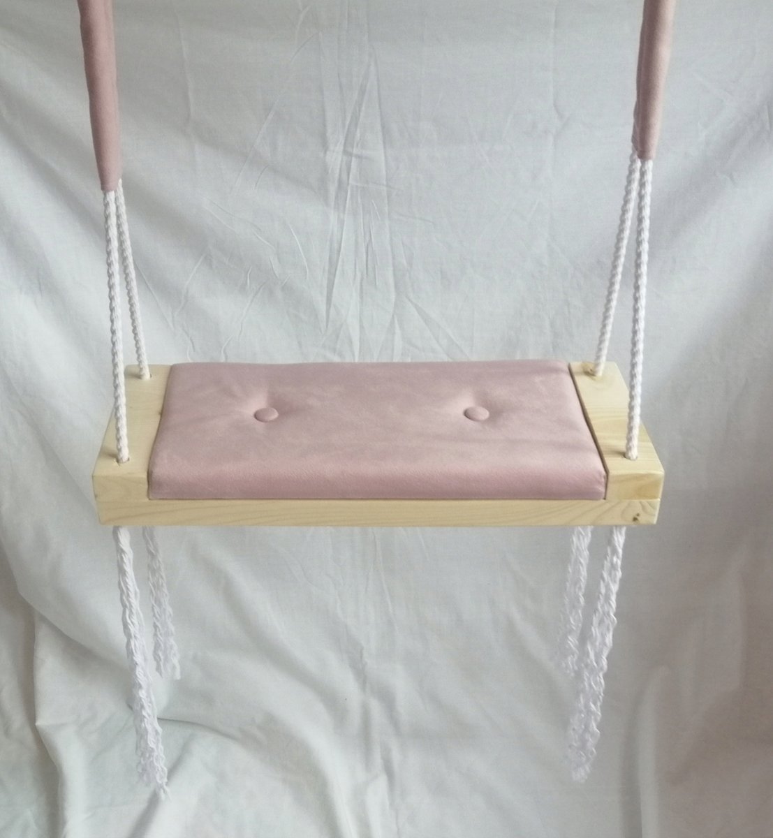 Oferujemy Państwu nową huśtawkę siedzisko na piance o grubości 3cm. Huśtawka wykonana jest z drewna oraz z mięciutkiego siedziska wykończonego materiałem pluszowym. Huśtawkę wykonujemy samodzielnie. Jest to produkt polski.
