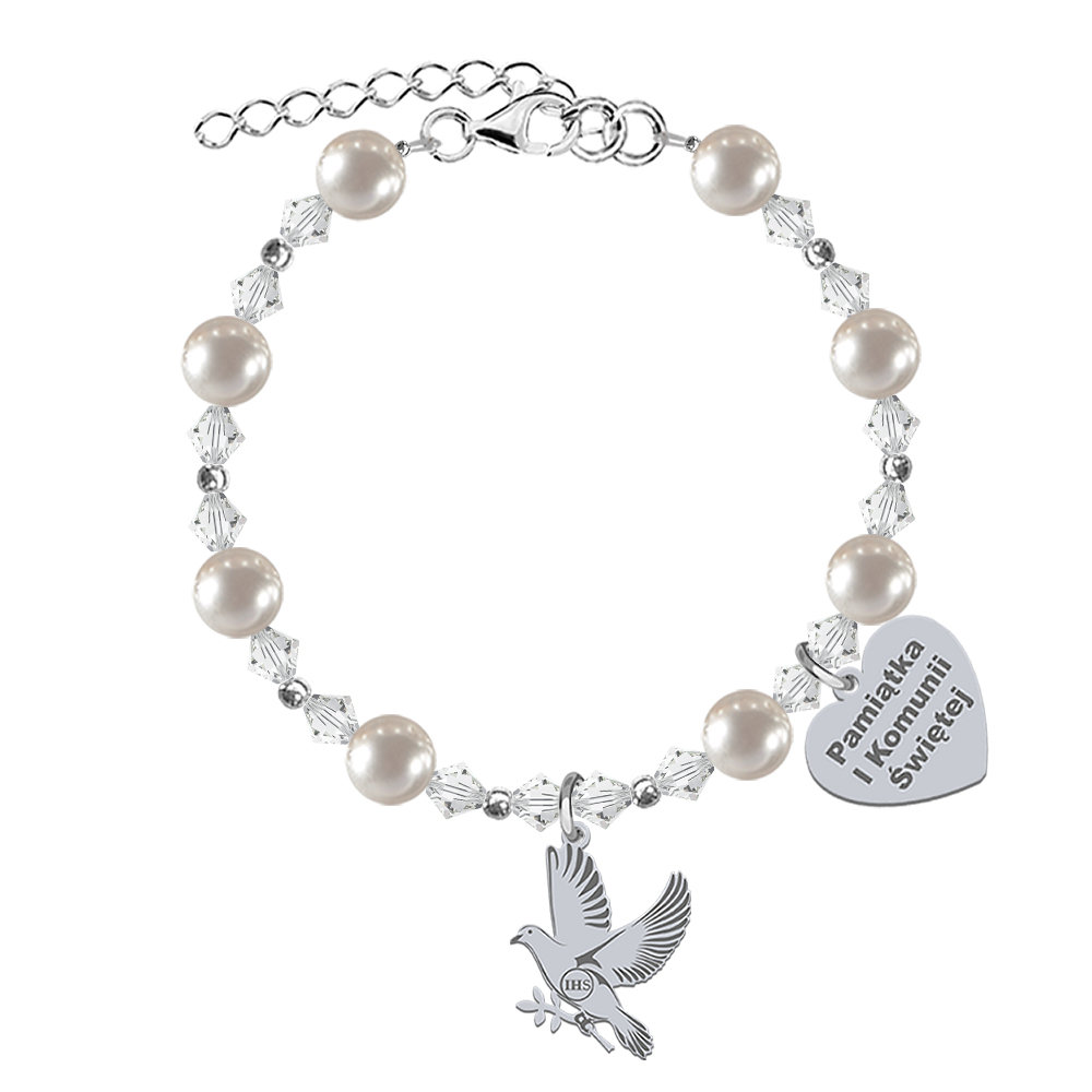 Srebrna bransoletka z Gołębiem na I Komunię Świętą. Wyjątkowe połączenie wysokiej jakości szklanych pereł i perfekcyjnie szlifowanych kryształów z dodatkiem srebrnych detali. Jest to idealny prezent ...
