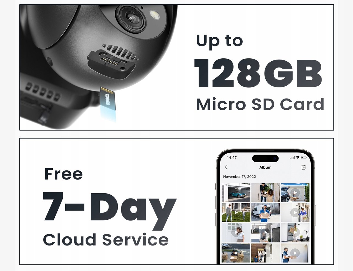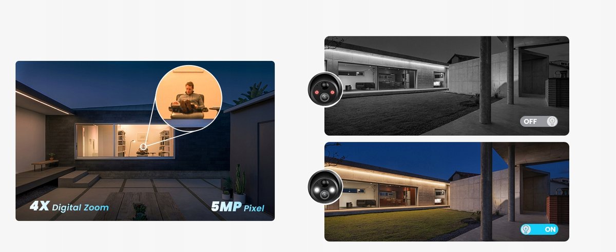 【Kolorowy noktowizor 5MP HD i sterowanie obrotem i pochyleniem w zakresie 360°】Wbudowane 2 białe światła zapewniają wyraźniejszy kolorowy obraz w nocy. Oglądaj obrazy w wysokiej rozdzielczości nawet w ciemności nocy, aby skutecznie identyfikować potencjalne zagrożenia. Dzięki obrotowi o 355°, pochyleniu o 120° i 4-krotnemu zoomowi cyfrowemu (bez automatycznego śledzenia) bezprzewodowe kamery bezpieczeństwa na zewnątrz zapewniają monitoring 360°, chroniąc Twój dom.