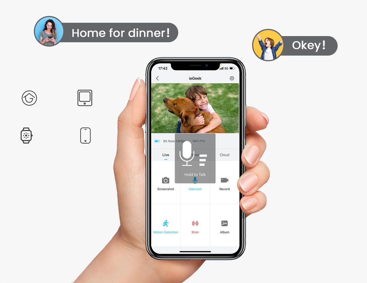 【Współdzielenie przez wielu użytkowników i szyfrowanie danych】Wystarczy zeskanować kod QR za pomocą aplikacji ieGeek Cam, aby bezprzewodowe kamery do monitoringu domu umożliwiły członkom rodziny współdzielenie zdalnego dostępu. Wszystkie filmy z kamer zewnętrznych do monitoringu domu są szyfrowane za pomocą zaawansowanej technologii szyfrowania AES128.Nikt nie może uzyskać do nich dostępu bez Twojej zgody, co zapewnia Ci spokój ducha.