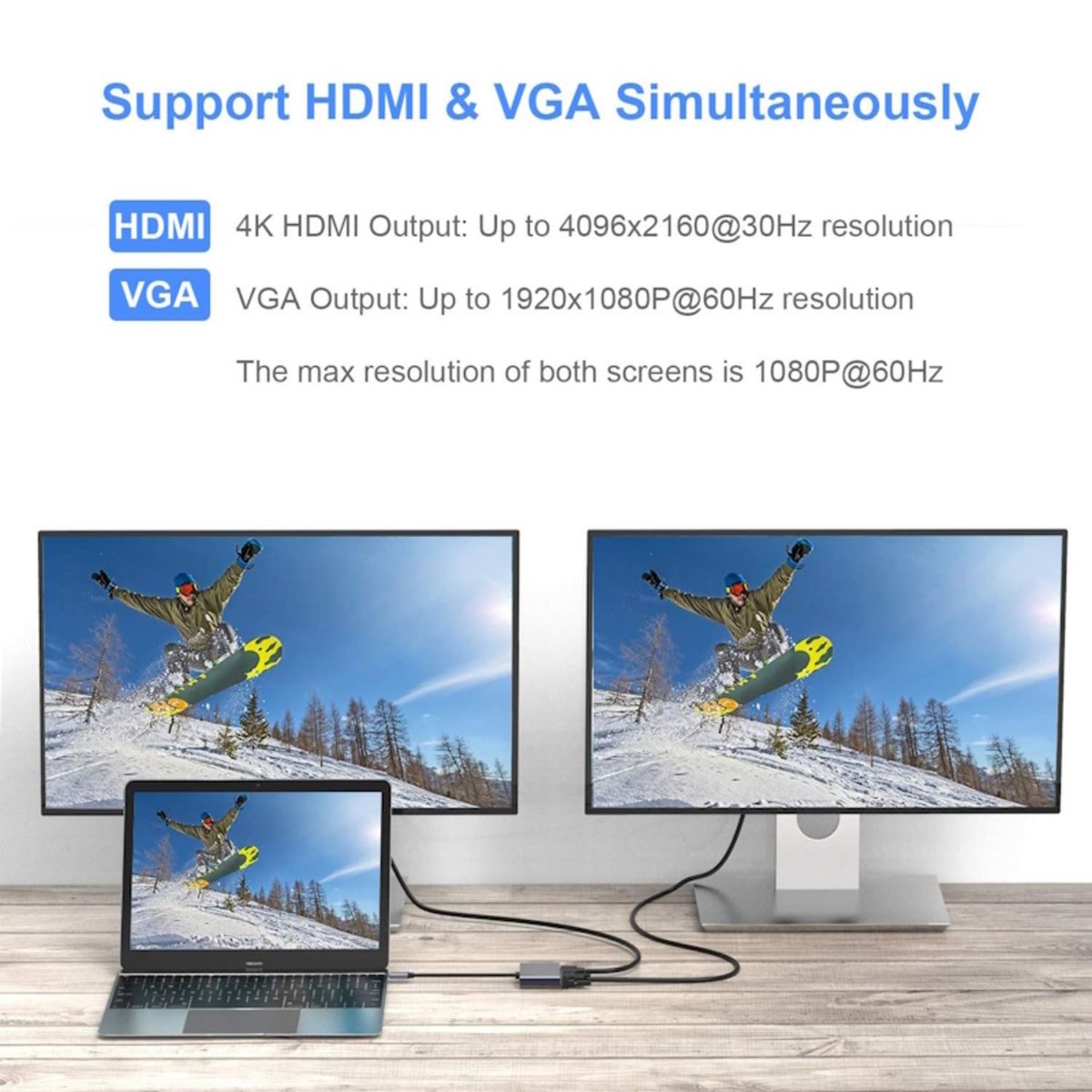 - Our USB-C Hub provides the ability to connect multiple screens simultaneously to your devices. The HDMI Port can transmit to large screen displays in up to 4K UHD quality @ 30Hz or in 1080p at 60Hz. The VGA port which is standard for monitors can display in up to upscaled 1080p quality. Both ports can be used at the same time to connect 2 extra displays to your device. The ports also support Extend and Mirror modes for laptops