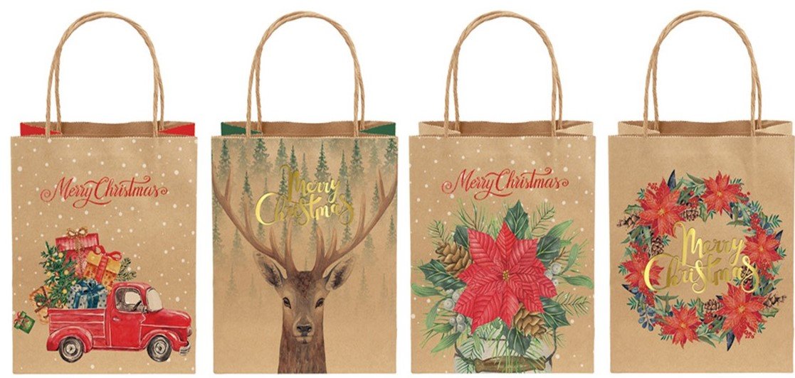 Świąteczne torby prezentowe wykonane z papieru brown craft o grubości 150gsm, zdobione hot stampingiem. Wymiary: 21x25,5x10cm, mix 4 wzorów