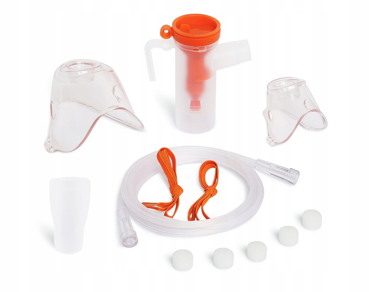 Nebulizator ( rozpylacz), przewód powietrza, Ustnik, Maska dziecięca, Maska dla dorosłych, Filtry (5szt).