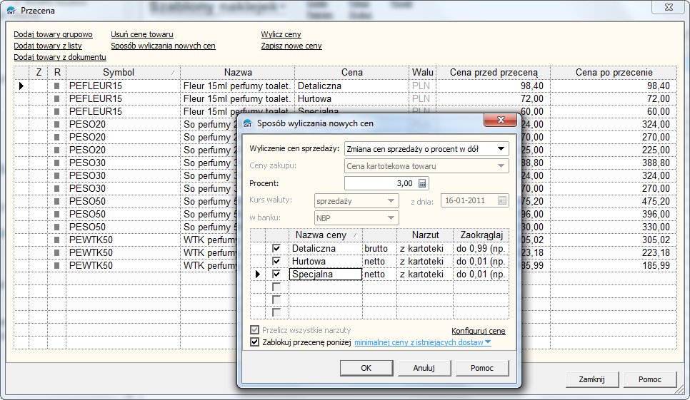 - prowadzenie kartoteki towarów, usług, kompletów i opakowań zwrotnych z rozbudowaną kalkulacją cen (10 poziomów cen sprzedaży, w tym ceny walutowe);