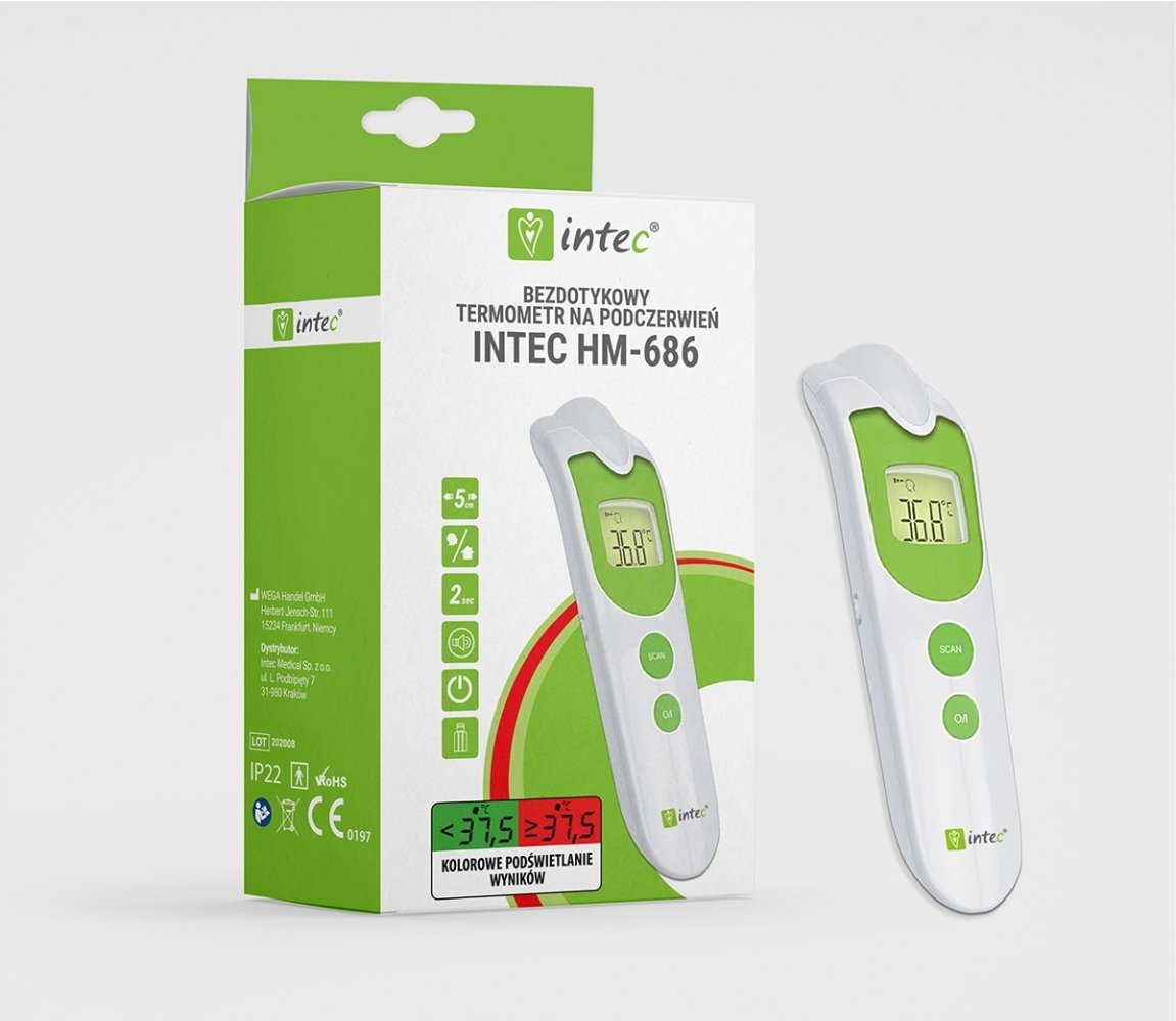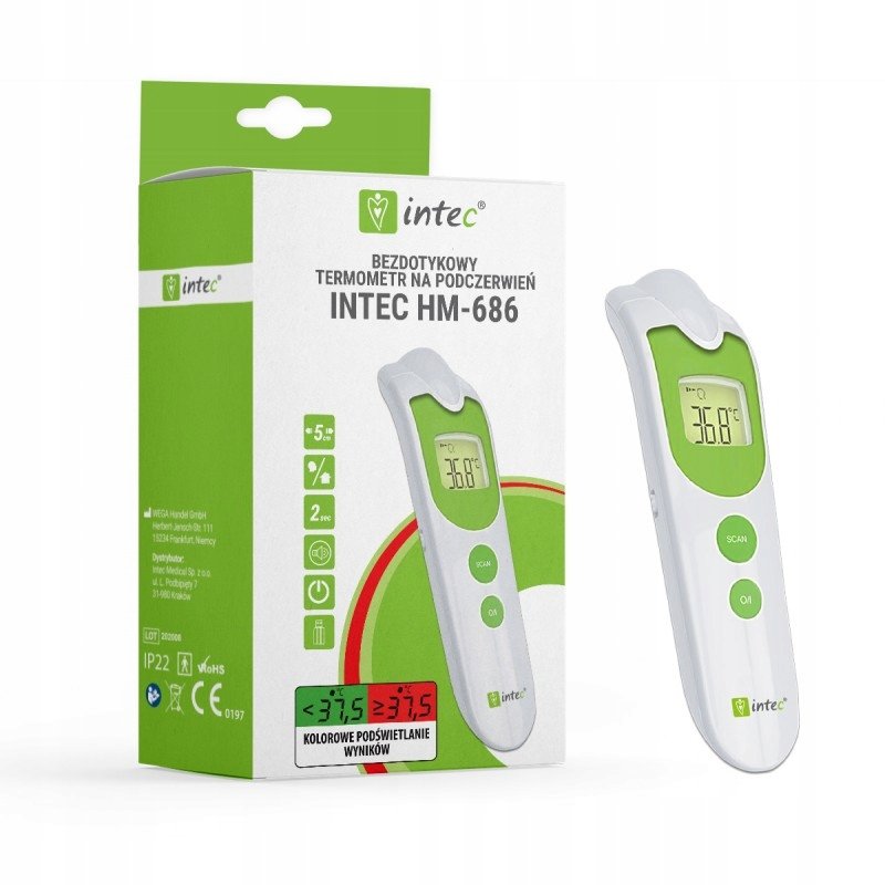 Intec HM-686 IntecProducent: Intectyp: elektroniczny, bezdotykowydokładność pomiaru: 0.1 st.Cpamięć ostatniego pomiaru: takfunkcje: podświetlany ekran LCD, zmiana koloru wyświetlacza w zależności od ...