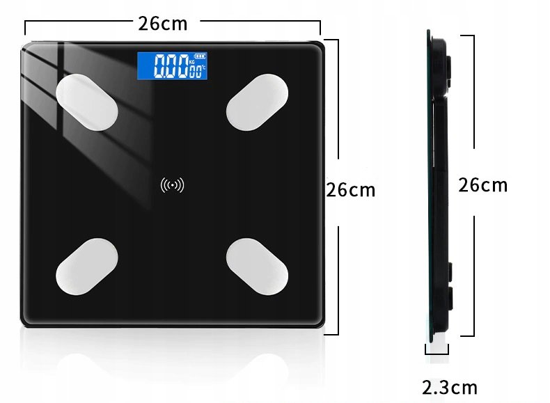 Inteligentna Waga Łazienkowa Analityczna Bluetooth Czarna Nowoczesna inteligentna waga elektroniczna wyposażona w wyświetlacz, który pokazuje nam nie tylko masę ciała, lecz także inne wskaźniki, m.in. zawartość wody, tłuszczu czy tkanki mięśniowej w organizmie. Najnowocześniejsze modele wag elektronicznych posiadają również pamięć wewnętrzną, która zapamiętuje nasze pomiary, analizuje je i porównuje. Dzięki funkcji Bluetooth można przesyłać dane do innych urządzeń, np. smartfona. Doskonała dla każdego. Świetnie sprawdzi się podczas wykonywania aktywności fizycznej by weryfikować swoje postępy. Nowoczesny styl Waga posiada duży, czytelny i podświetlany ekran LCD pozwalający na odczyt: Wyników pomiarów Temperatury otoczenia Oraz stan naładowania baterii Posiada funkcje zapamiętywania użytkowników, dzięki czemu cała rodzina może korzystać z niej naprzemiennie nie tracąc pozyskanych dotąd danych. Dużo przytanych funkcji: Dzięki tej wadze sprawdzić takie parametry jak: Waga Masa ciała Masa mięśniowa Masa tkanki tłuszczowej Masa wody Masa tkanki kostnej Poziom tkanki kostnej w % Zawartość wody w organizmie % Zawartość tłuszczu w organizmie % Zawartość mięśni w organizmie % BMI Kontrola stopnia otyłości Kontrola prawidłowej wagi BMR - dzienne zapotrzebowanie kaloryczne Kontrola postępów Pamięć pozwala na analizę wyników Możliwość zapisu i pomiarów dla 8 użytkowników Dane techniczne Szklana waga łazienkowa analityczna Bezpłatna aplikacja "OKOK" na smartfona w języku polskim (na iOS oraz Android) kompatybilna z wagą Kontroluj poziom zdrowia swojego organizmu Posiada funkcję automatycznego włączania/wyłączania (oszczędność baterii) Antypoślizgowe stopki Szklana powłoka antybakteryjna zapewniająca utrzymanie wagi w czystości Szkło hartowane: 4 mm Łączność: Bluetooth Wskaźnik temperatury otoczenia Maksymalna waga użytkownika: 180 kg Duży, czytelny ekran LCD z podświetleniem Wymiary: 26 x 26 x 2,5 cm Pełna kontrola wyników w 1 miejscu Zapisuj pomiary i monitoruj swoją wagę oraz skład ciała w dedykowanej do tego aplikacji! Wystarczy, że zainstalujesz ją na swoim smartfonie lub tablecie. Jeśli ćwiczysz lub zmieniasz dietę to dzięki niej z łatwością możesz sprawić, jak zmienia się Twój skład ciała. Od teraz możesz analizować pomiary z każdego dnia, a także zobaczyć swoją średnią wagę w miesiącu czy roku. I Inteligentna waga połączona ze smartfonem, w którym włączona jest funkcja Bluetooth, automatycznie prześle wynik na Twoje urządzenie