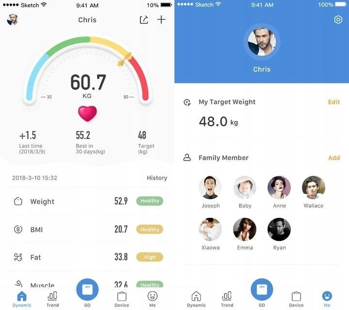 Inteligentna waga połączona ze smartfonem, w którym włączona jest funkcja Bluetooth, automatycznie prześle wynik na Twoje urządzenie. Aplikacja umożliwia udostępnianie parametrów swojego ciała za pośrednictwem mediów społecznościowych znajomym i rodzinie.