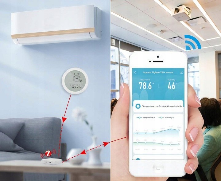 Czujnik Temperatury i Wilgotności ZigBee z Wyświetlaczem LCD – Precyzyjne Monitorowanie Warunków w Twoim Domu UWAGA! W celu utworzenia sieci połączonych urządzeń i łączności zdalnej (poza zasięgiem ...