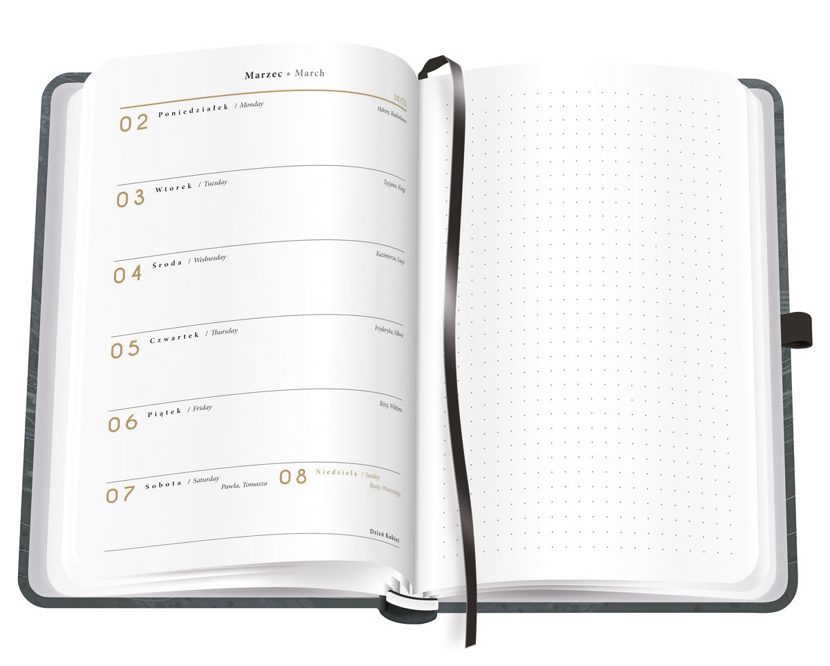 Kalendarz książkowy A5 192 strony Metallic Savage: format: A5, ilość stron: 192, kalendarium: 1 tydzień na stronie i miejsce na notatki, kartki w kropki do planowania i rysowania, twarda ...