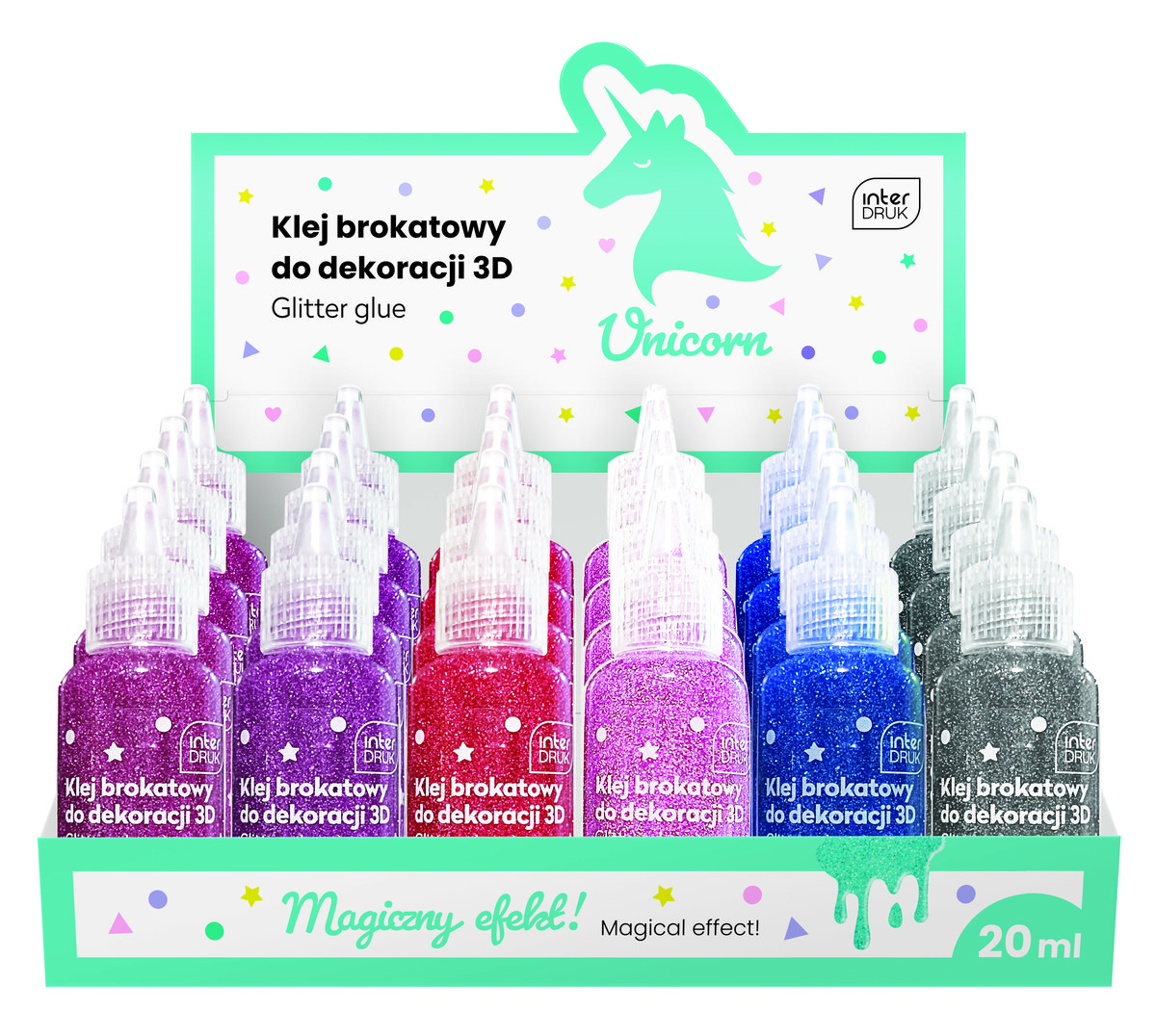 Klej brokatowy UNICORN 3D: pojemność: 20 ml, butelka z wygodnym aplikatorem, końcówka aplikatora zapewnia czystą i precyzyjną aplikację, spieralny i elastyczny po wyschnięciu, świetnie ...