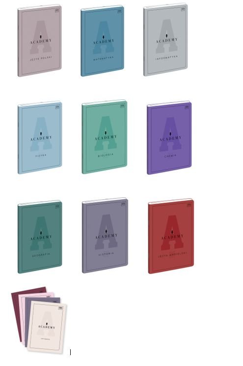 Academy to kolekcja papiernicza premium stworzona z myślą o uczniach i studentach, którzy cenią sobie styl, jakość produktu i komfort pisania. Nasze produkty Academy powstały z myślą o każdym detalu – grube kartki 90 g, miłe w dotyku i eleganckie wykończenie okładki czy zaokrąglone rogi zagwarantują najwyższą przyjemność ich użytkowania. Dzięki szerokiemu i różnorodnemu asortymentowi Academy każdy znajdzie dla siebie zeszyt, kołozeszyt czy brulion w idealnym dla siebie formacie. Kolekcja dostępna jest w dwóch stylowych odsłonach kolorystycznych: pastelowej i stonowanej.