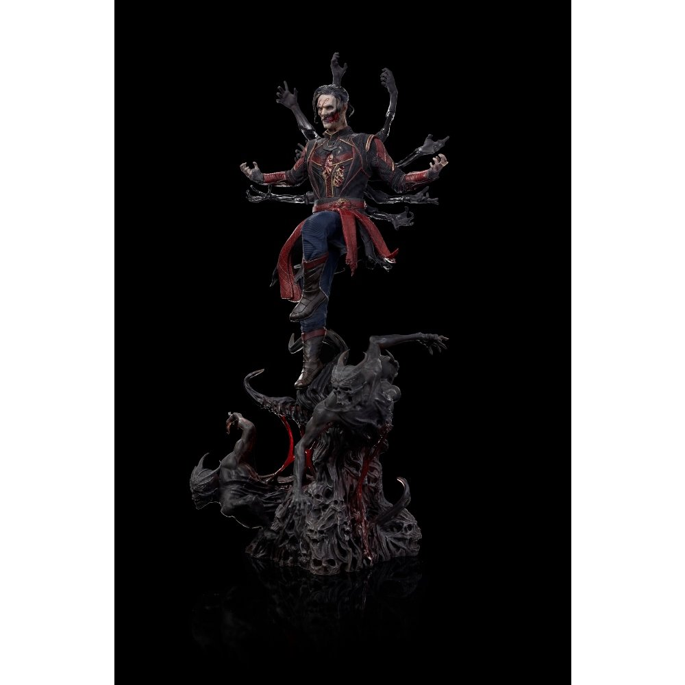 Otulony peleryną utworzoną przez mroczną mgłę złowrogich stworzeń, prezentujący wiele zepsutych i szkieletowych ramion, pojawia się makabryczna postać zombie bohatera czarnoksiężnika, lewitująca nad podstawą złożoną z demonicznych cieni potępionych dusz. Posiadając zwłoki swojego odpowiednika z innego wszechświata, Dr Stephen Strange wykorzystuje wiedzę Darkhold, Księgi Potępionych, poczętej w wymiarze Piekła, aby kontrolować złe duchy przyciągnięte przez zakazane zaklęcie i wykorzystać je do stawienia czoła oszalałej Szkarłatnej Wiedźmie. W ten sposób Iron Studios prezentuje swoją statuetę "Dead Defender Strange - Doctor Strange in the Multiverse of Madness - Art Scale 1/10", inspirowaną kultową sceną z drugiego filmu o najwyższym czarodzieju Marvela.Iron Studios wprowadza również wersję deluxe statuetki zombifikowanego czarnoksiężnika, ze statuetką "Dead Defender Strange deluxe - Doctor Strange in the Multiverse of Madness - Art Scale 1/10", przedstawiającą nieumarłego bohatera z peleryną stworzoną przez wielką mgłę i ujawniającą się z wieloma zepsutymi ramionami.Pochodząca z innego wszechświata, alternatywna wersja Najwyższego Czarnoksiężnika, znana jako Obrońca Strange, próbowała pomóc Américi Chavez, dziewczynie ze zdolnością podróżowania po Multiwersum. Strange zdał sobie sprawę, że jej moc jest zbyt niebezpieczna i próbował ją jej odebrać, ale ostatecznie został zabity przez stworzenie przywołane przez Scarlet Witch, aby schwytać Chavez, wyłącznie w celu wykorzystania jej mocy. W swoim ostatnim tchnieniu uwolnił Chavez od stworzenia, a ona uciekła do innego wszechświata, tak zwanej Ziemi-616, gdzie spadła w Nowym Jorku przez portal obok zwłok Strange'a. Uratowana przez Doctora Strange'a i Wonga z tego wszechświata, aby udowodnić bohaterom swoje pochodzenie, pokazała zwłoki Obrońcy Strange'a, które następnie zostały przez nich pochowane. Po wielu bitwach została schwytana i zabrana na Górę Wundagore, gdzie została umieszczona na ołtarzu przez Scarlet Witch, z zamiarem pozbawienia jej mocy. Aby powrócić do własnego wszechświata i ją uratować, Doctor Strange użył zombie zwłok Defendera Strange'a poprzez zakazane zaklęcia z księgi Darkhold, aby opętać zmarłych i stawić czoła Maximoffowi, wykorzystując ducha potępionych, który stanął przed nim.