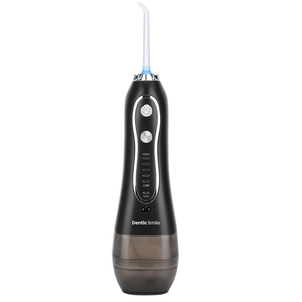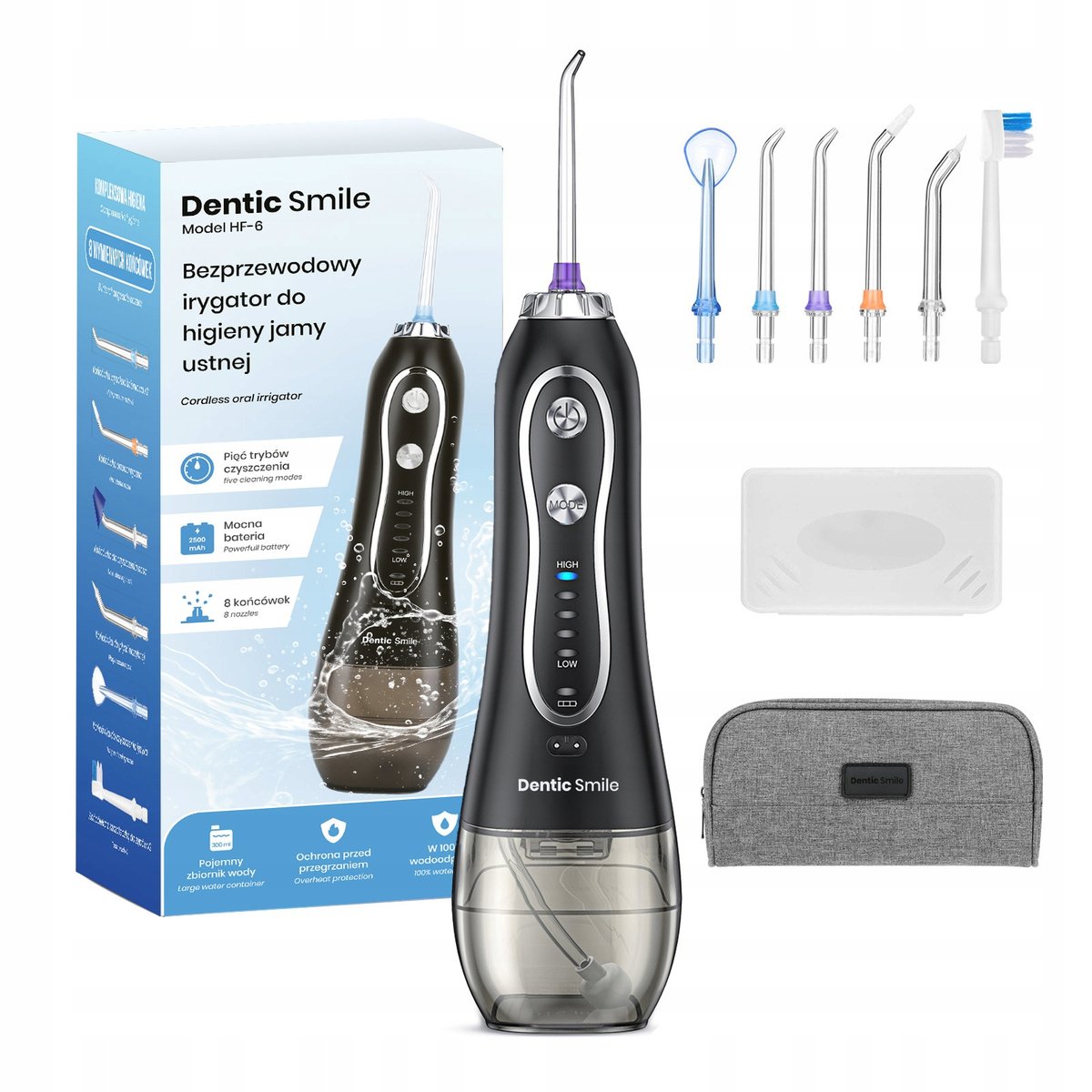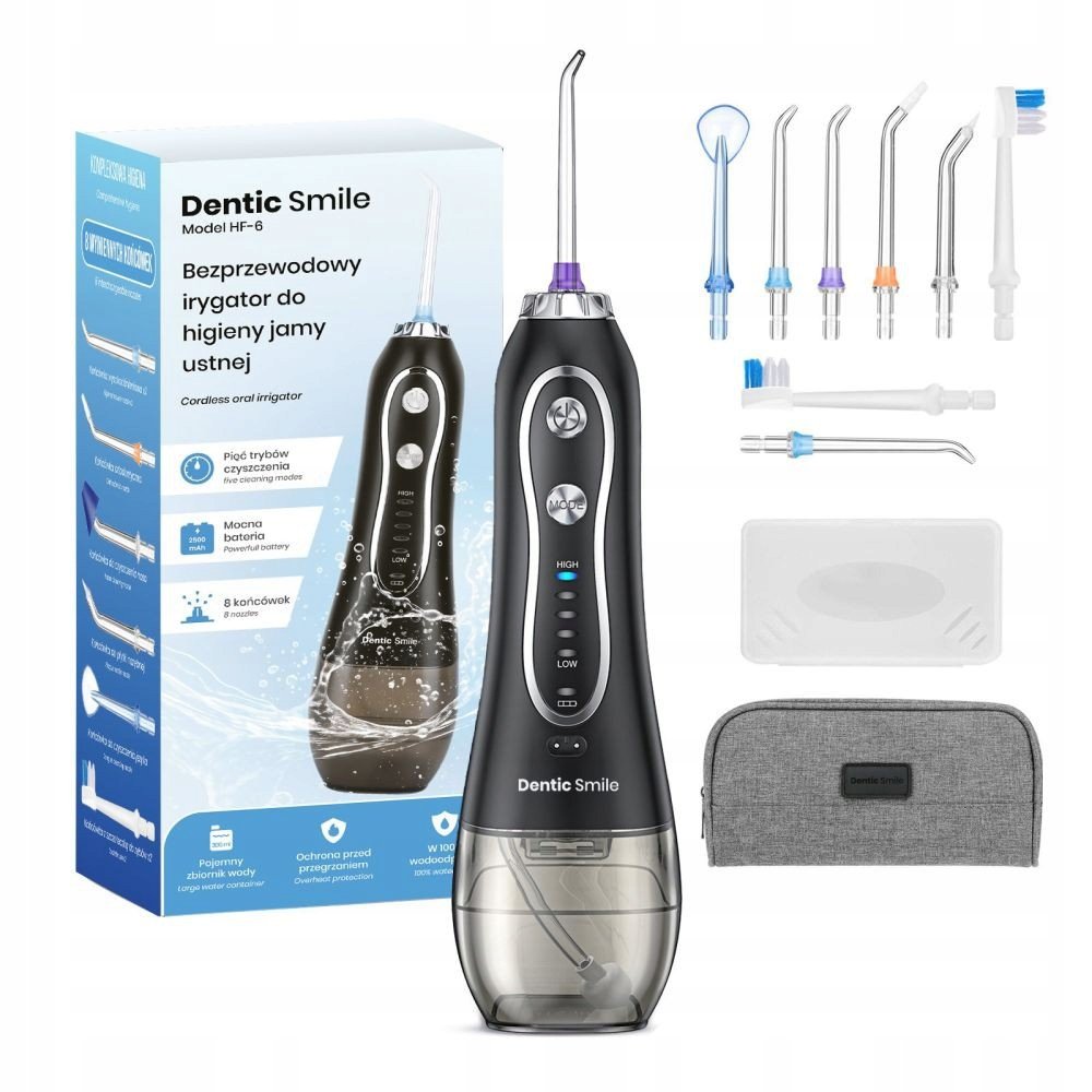 Irygator Dentic Smile 8 sztuk wymiennych końcówek Kabel ładujący USB Etui w kolorze szarym Oryginalne pudełko Instrukcja obsługi