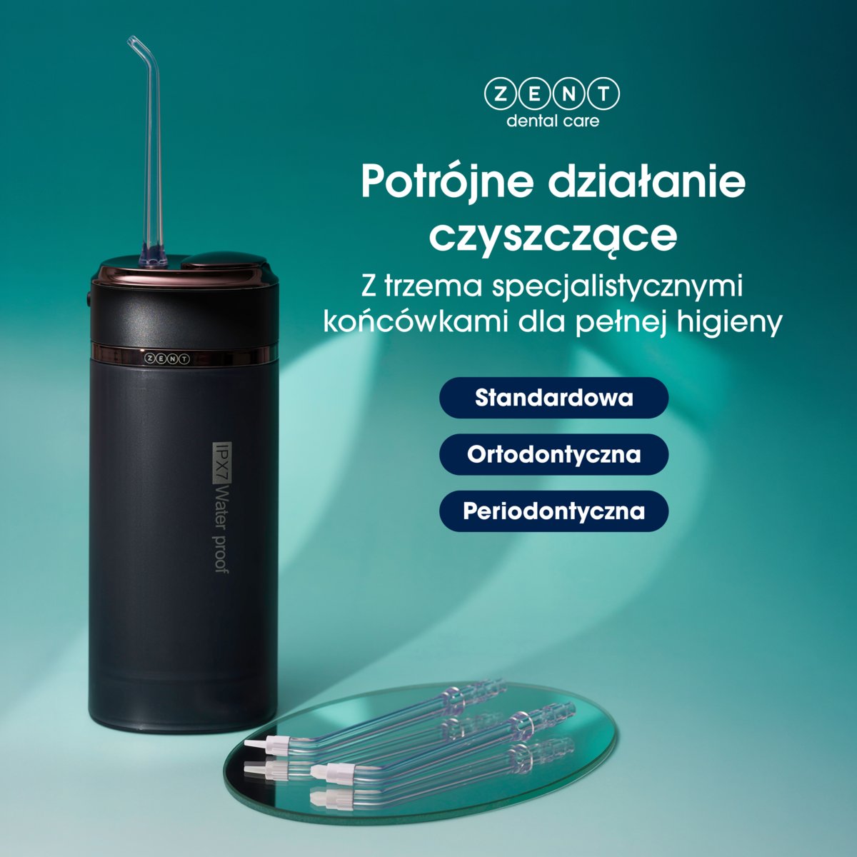 Nazwa: Profesjonalny irygator do zębów ZENT Stream+ bezprzewodowy PRO 360°, 3 tryby, 3 specjalistyczne końcówki, 1500 pulsacji/min, regulowane ciśnienie, Granatowy