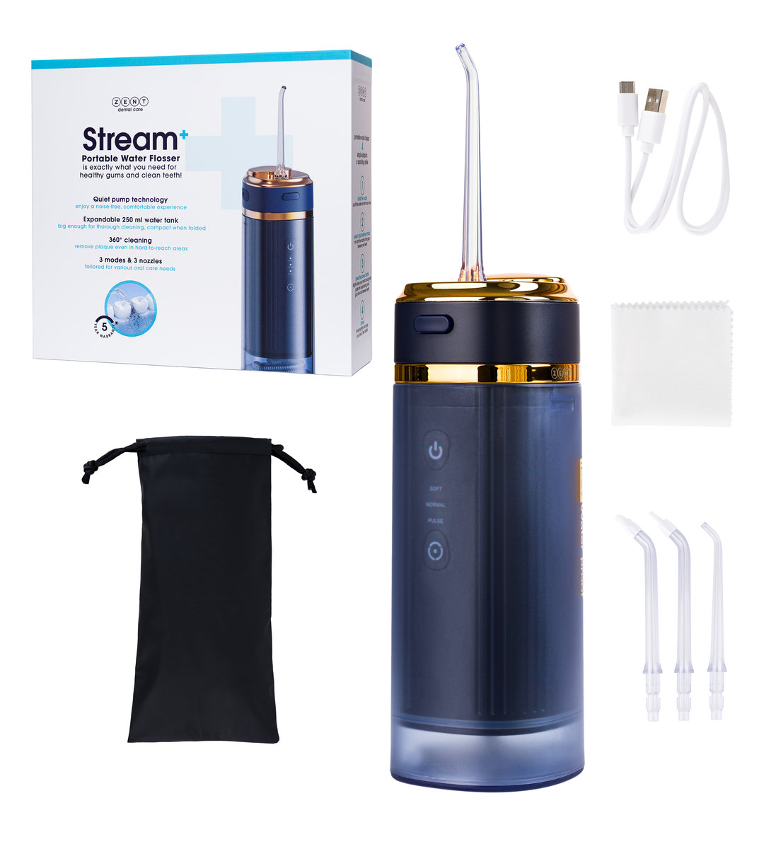 Profesjonalny irygator do zębów ZENT Stream+ bezprzewodowy PRO 360°, 3 tryby, 3 specjalistyczne końcówki, 1500 pulsacji/min, regulowane ciśnienie, Granatowy