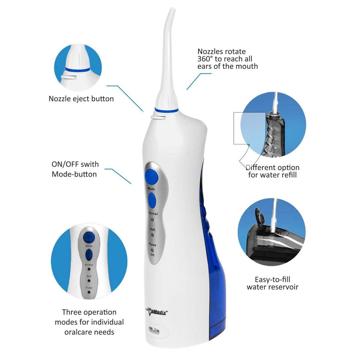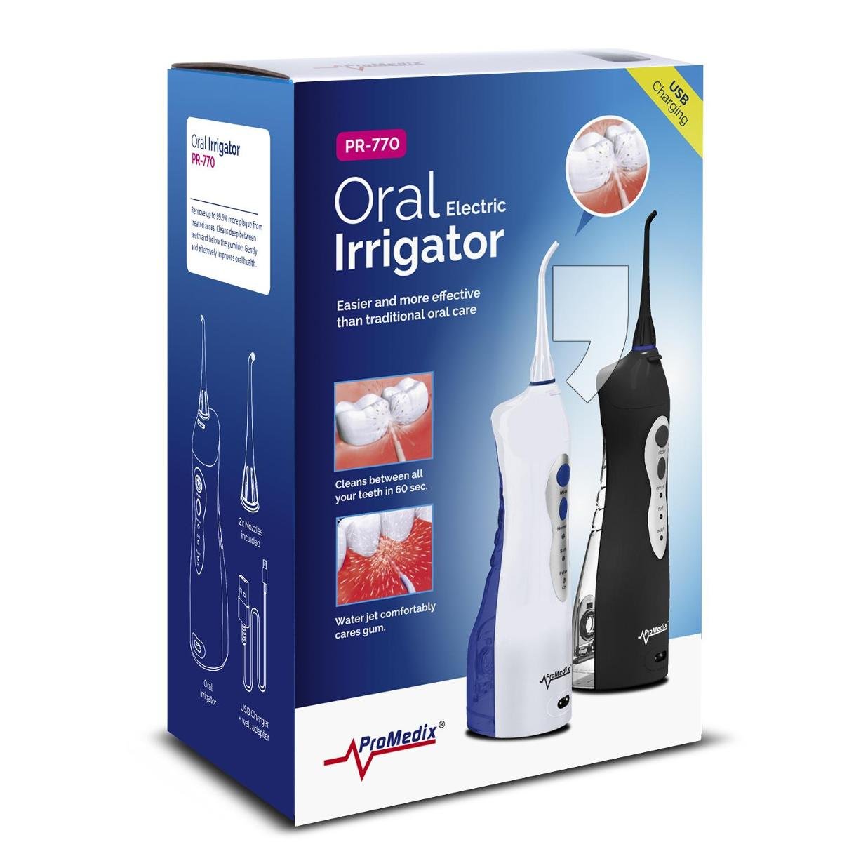 Irygator stanowi bardzo dobre uzupełnienie szczoteczki do zębów. Pozwoli on na dotarcie do niedostępnych dla innych urządzeń miejsc w jamie ustnej. Jego działanie polega na wytwarzaniu wody pod ciśnieniem. Dokładnie płucze ona zalegające nieczystości. PROMEDIX PR-770W posiada zasilanie akumulatorowe, a pojemność zbiornika na wodę wynosi 160 ml.