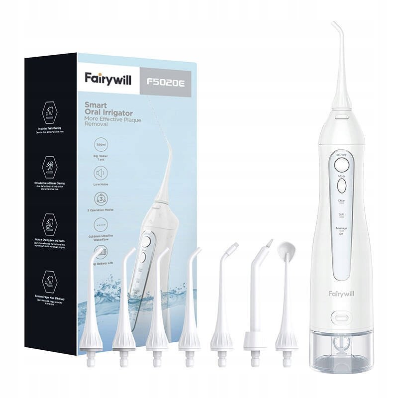 Producent FairyWill Model 5020E Kolor Biały Moc 5 W Czas ładowania Ok. 4 h Czas pracy Do 21 dni Pojemność akumulatora 1400 mAh Pojemność zbiornika na wodę 300 ml Ciśnienie 30-100 PSI