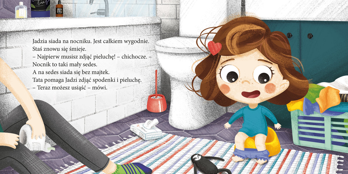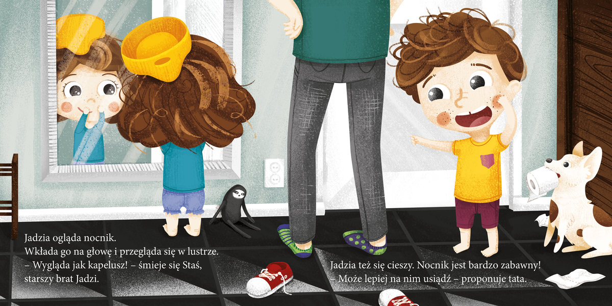 Jadzia dostała prezent! Ale co to? Coś na głowę, coś do przechowywania zabawek? Nie, to nocnik do robienia siku! Staś – brat Jadzi – o tym wie, ale Jadzia dopiero uczy się, do czego służy