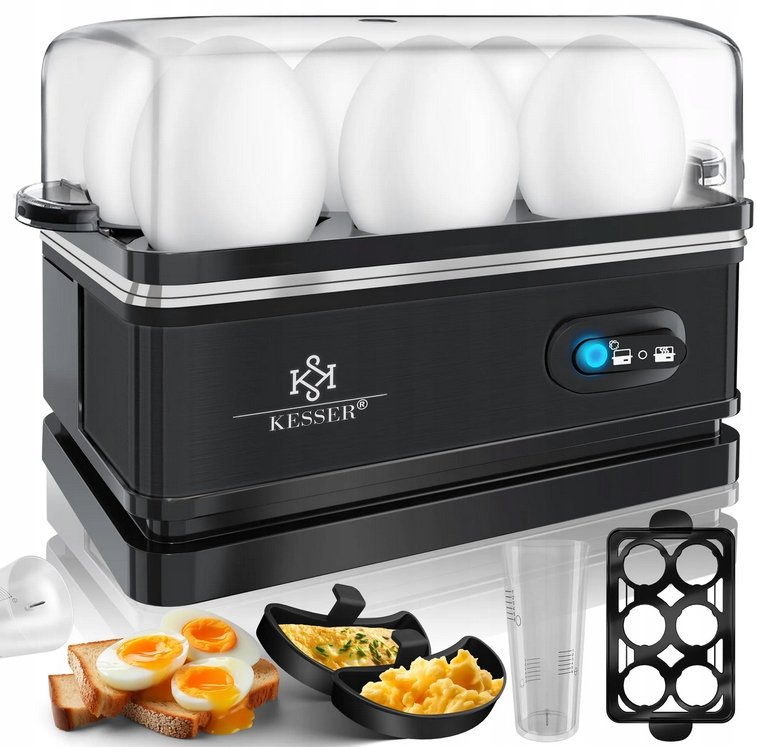 KESSER jajowar ma moc 400W i elegancki, wysokiej jakości stalowy design, co czyni go nie tylko wydajnym, ale także bardzo trwałym. Funkcja podgrzewania pozwala utrzymać jajka w cieple do momentu serwowania. Dzięki przyciskowi LED z trzema funkcjami oraz niebieskiej lampce sygnalizacyjnej, obsługa urządzenia jest prosta i intuicyjna.