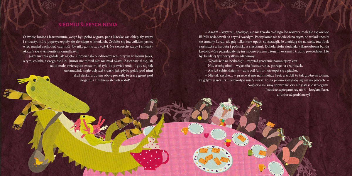 Kiedy pan i Pani Kaczka decydują się adoptować jajo, nie spodziewają się żadnych problemów. A jednak. Junior, który wykluwa się z jaja, zupełnie nie przypomina rodziców. Jest… krokodylem. Któregoś dnia Junior orientuje się, że zupełnie nie jest podobny do państwa Kaczek i postanawia odszukać swoich prawdziwych rodziców. Towarzyszy mu napotkana po drodze Jaszczurunia. Junior trafia do dzielnicy Lepszy Świat, a w końcu do domu państwa Krokodyli. Wcale jednak nie jest taki szczęśliwy, jak mogłoby się to wydawać. Jaszczurunia to mądra i wzruszająca opowieść o potędze marzeń i poszukiwaniu swojego miejsca na ziemi.