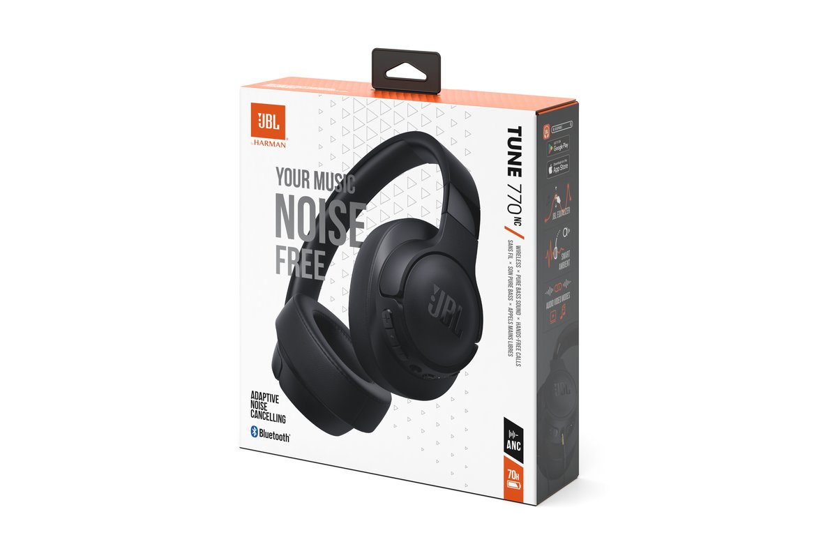 Lekkie i składane na płasko słuchawki JBL Tune 770NC łącza się z dwoma urządzeniami Bluetooth® jednocześnie, dzięki czemu nigdy nie przegapisz połączenia, np. oglądając film na tablecie. Dzięki bezpłatnej aplikacji JBL Headphones możesz dostosować dźwięk do własnych potrzeb.