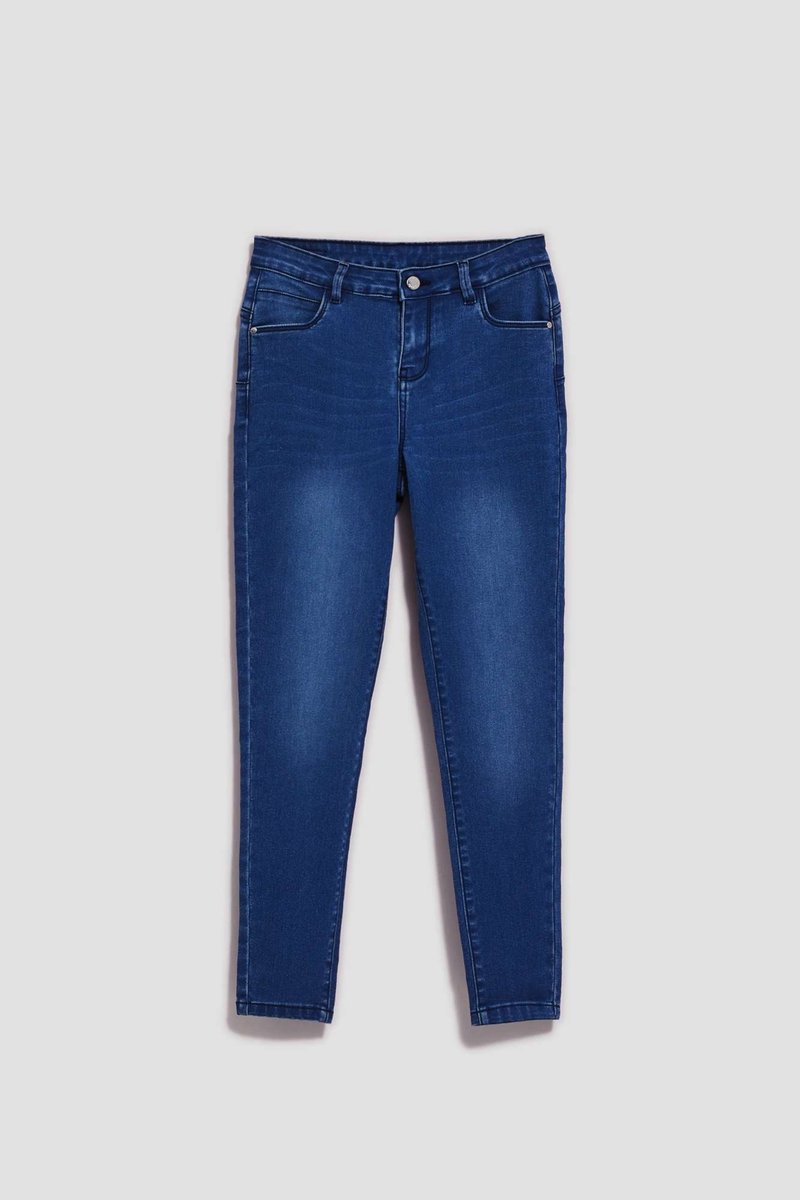 74% BAWEŁNA 24% POLIESTER 2% ELASTAN Spodnie jeansowe w granatowym kolorze. Średni stan, w pasie szlufki. Zapinane na guzik oraz zamek błyskawiczny. Długie nogawki typu skinny, dopasowane do ...