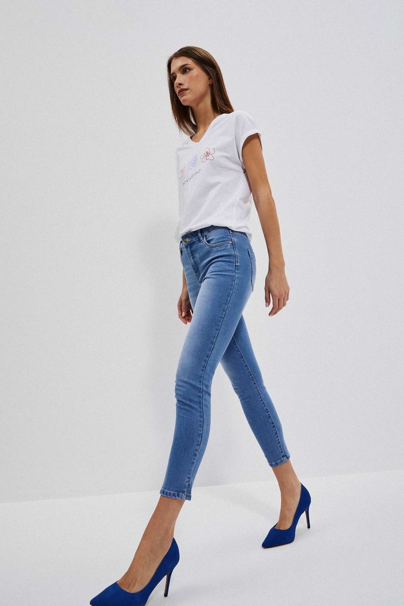 78% BAWEŁNA, 20% POLIESTER, 2% ELASTAN Spodnie jeansowe w typie skinny. Uszyte w kolorze jasnoniebieskim z ciekawymi przetarciami na udach. Posiadają dwie wsuwane kieszenie z przodu na biodrach i dwie z tyłu na pośladkach. Długie wąskie i przylegające do ciała nogawki, delikatnie rozcięte przy kostce. Spodnie zapinane na guzik i zamek błyskawiczny. Gładkie, bez wzoru. Średni stan w pasie oraz szlufki, dzięki którym możesz nosić jeansy z paskiem. Jeansy uszyte z bawełny, z dodatkiem elastycznych włókien. Bardzo wygodne i komfortowe w noszeniu, nie krępują ruchów. Musisz je mieć.