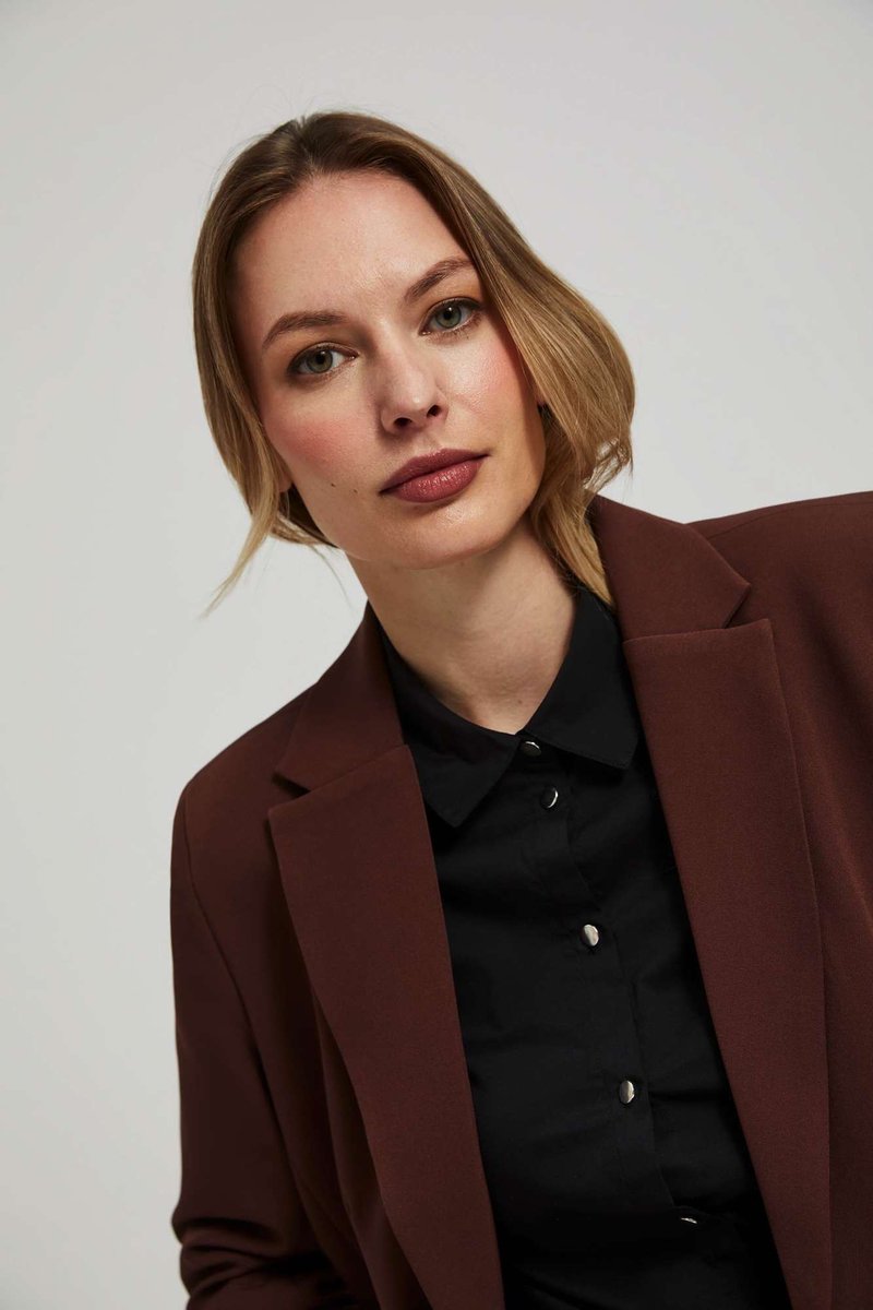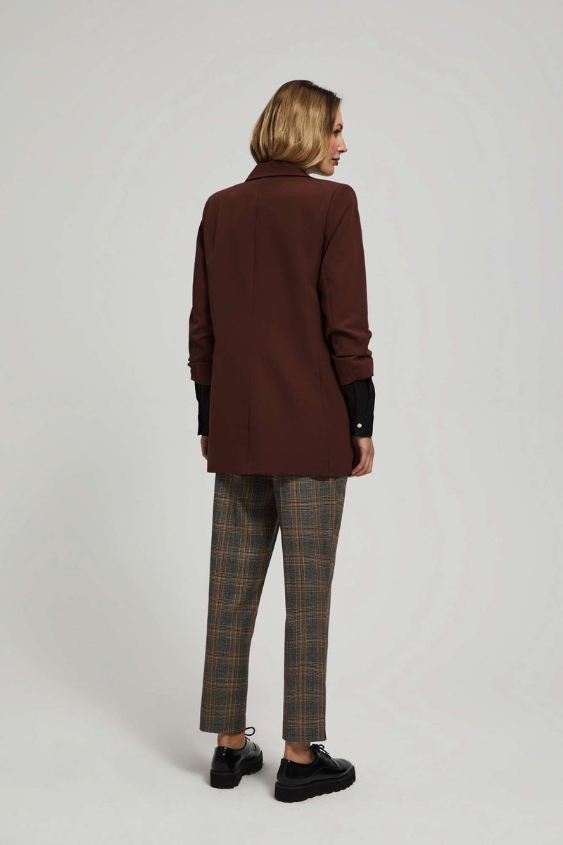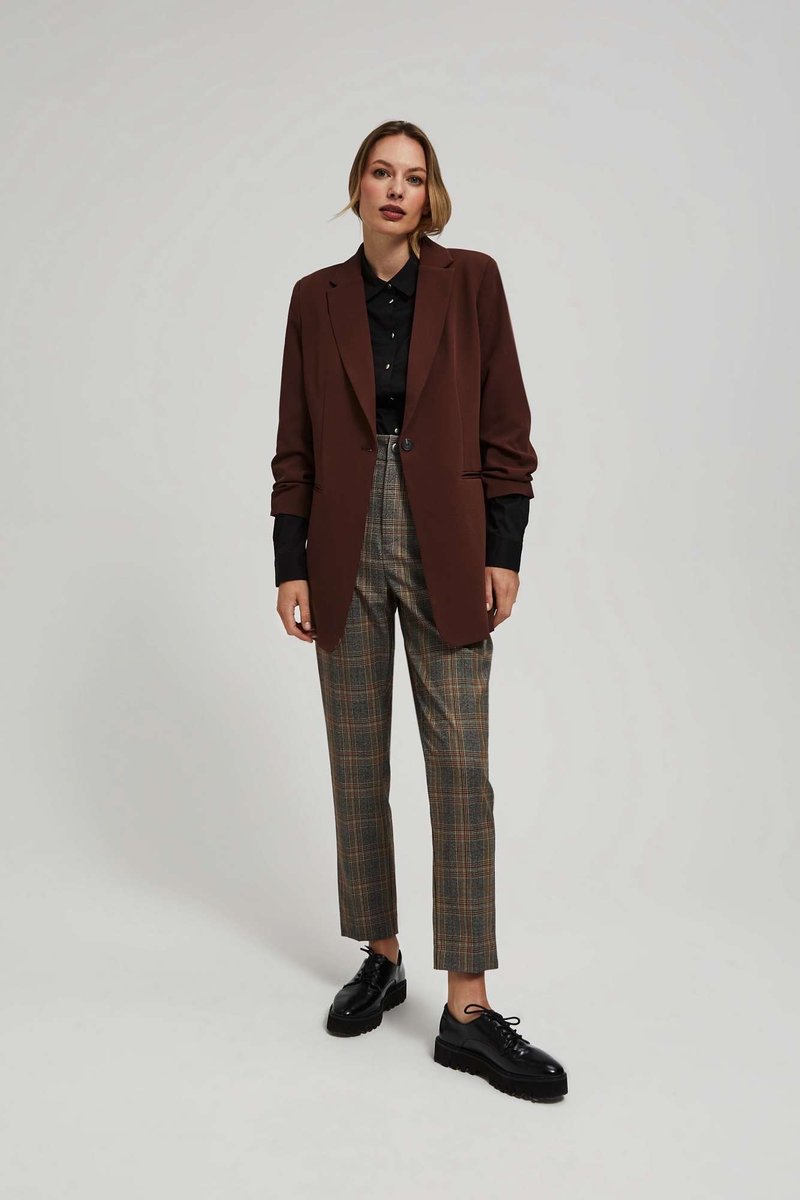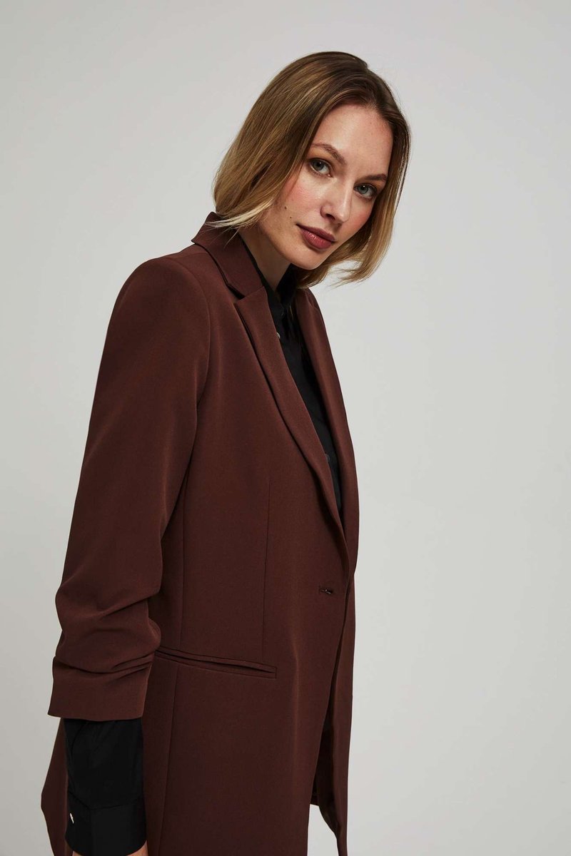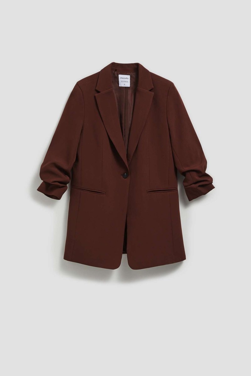 95% POLIESTER, 5% ELASTAN Marynarka damska w kolorze brązowym to idealny wybór dla kobiet, które cenią sobie elegancję i stylowe wygląd. Wykonana z wysokiej jakości poliestru, zapewnia trwałość i komfort noszenia. Jednorzędowy fason sprawia, że marynarka prezentuje się bardzo elegancko, a gładka tkanina bez wzoru dodaje jej ponadczasowego charakteru. Marszczone rękawy nadają marynarce unikalnego wyglądu, dodając subtelności i kobiecości. Dodatkowo, rękaw 3/4 sprawia, że jest to idealny wybór na cieplejsze dni. Kieszonki umieszczone na froncie są praktyczne i dodają marynarce nutki swobodnego stylu. Marynarka jest idealnym wyborem zarówno na co dzień, jak i na specjalne okazje. Może być noszona w połączeniu z elegancką spódnicą lub spodniami, tworząc stylowy zestaw na wieczorne wyjścia. Jednocześnie, świetnie komponuje się również z jeansami i koszulką, nadając casualowemu lookowi wyjątkowego charakteru.