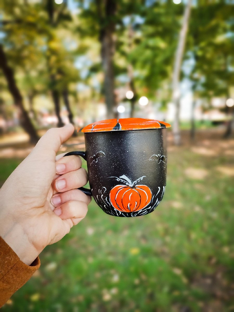 Jesienny kubek do herbaty i ziół z motywem dyni, czarnego kota i nietoperzy.Zestaw zawiera kubek 350 ml., pokrywkę i metalowe sitko na herbatę.Idealny prezent dla bliskiej ci osoby uwielbiającej ...