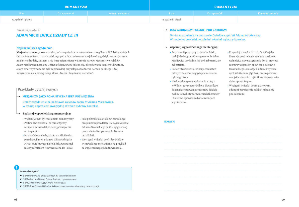 Zamieszczony na początku książki kalendarz z rozpisanymi na poszczególne dni tematami do powtórki pozwala na bieżąco kontrolować opanowany materiał i zaznaczać zrealizowane tematy, a także dodawać uwagi dotyczące postępów w utrwalaniu wiedzy. W zasadniczej części organizera znalazły się opracowane w przejrzystym układzie graficznym szczegółowe zagadnienia do powtórki na każdy dzień, a także skrótowe informacje, podpowiedzi i wskazówki dotyczące wszystkich wymaganych na egzaminie lektur i ich kontekstów, zagadnień związanych z wiedzą o epokach literackich oraz wiedzą o języku, przykłady tematów otwartych na egzamin ustny, testy sprawdzające wiedzę i mnóstwo cennych podpowiedzi – jak budować wypowiedź argumentacyjną, notatkę syntetyzującą i inne formy wypowiedzi przydatne na maturze.