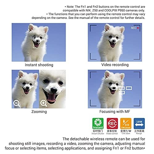 Jedną z głównych cech tego produktu jest funkcja zdalnego sterowania. Pilot umożliwia nagrywanie zdjęć, nagrywanie wideo, powiększanie aparatu, regulację ręcznego ustawiania ostrości, wybieranie elementów lub aplikacji oraz przypisywanie przycisku Fn1 lub Fn2 (tylko do aparatów Nikon Z6II Z7II Z fc Z50 i COOLPIX P950). Dzięki temu użytkownik może kontrolować aparat z odległości około 10 metrów, co daje większą swobodę i kreatywność podczas fotografowania.