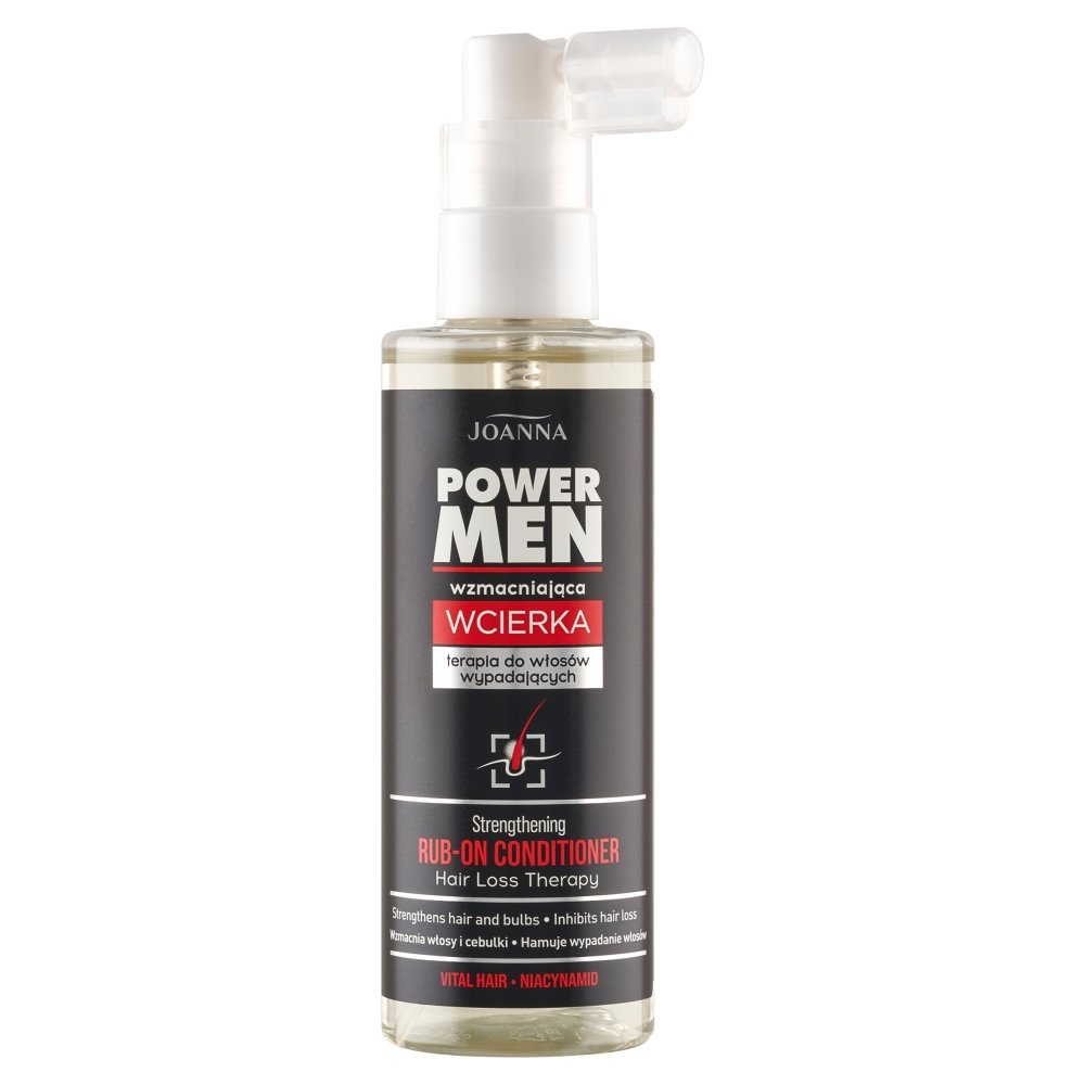 Suplement diety, Joanna Power Men wzmacniająca wcierka do włosów wypadających 100mlOdżywka-wcierka ze złożonym ekstraktem ziołowym, kompleksem Vital Hair, niacynamidem, alantoiną i pantenolem ...
