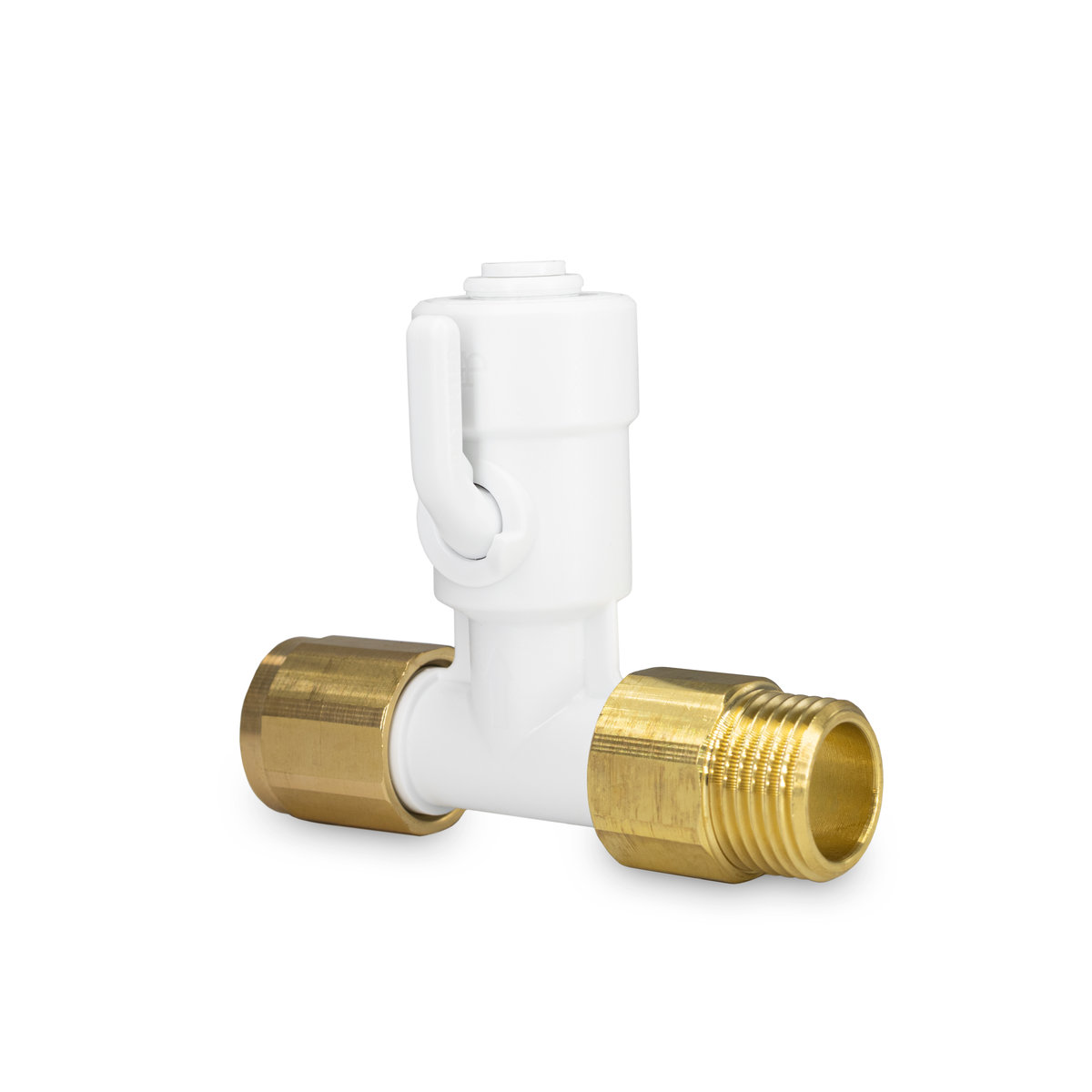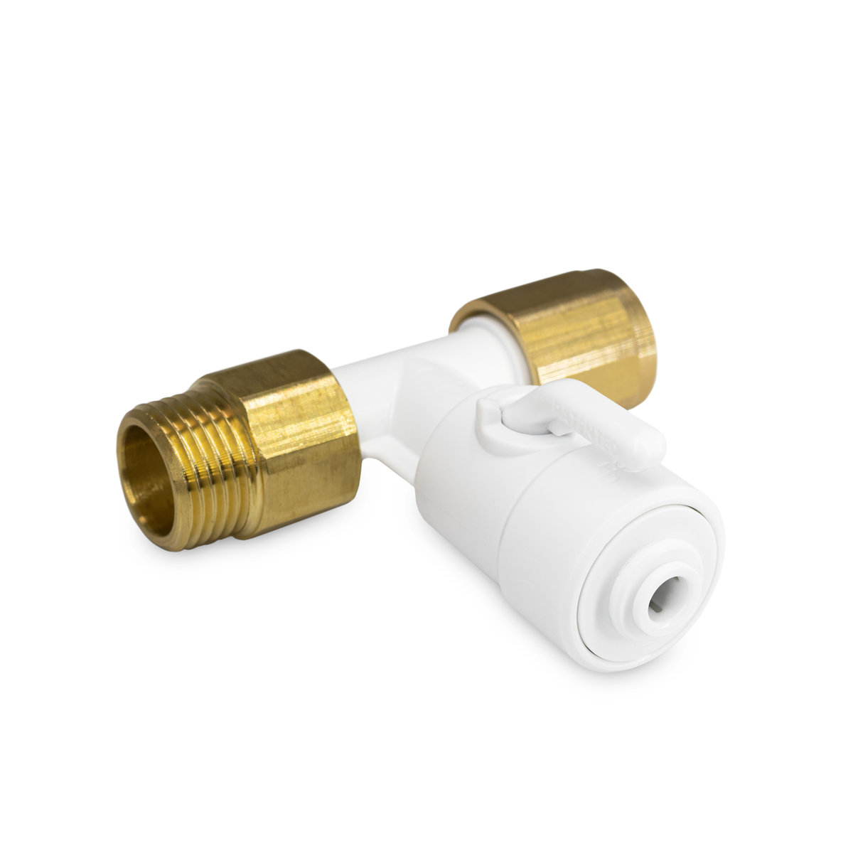 ASV10 kątowy zawór odcinający z zaworem zwrotnym marki John Guest. Element został stworzony specjalnie do podłączenia bocznego zaworu.