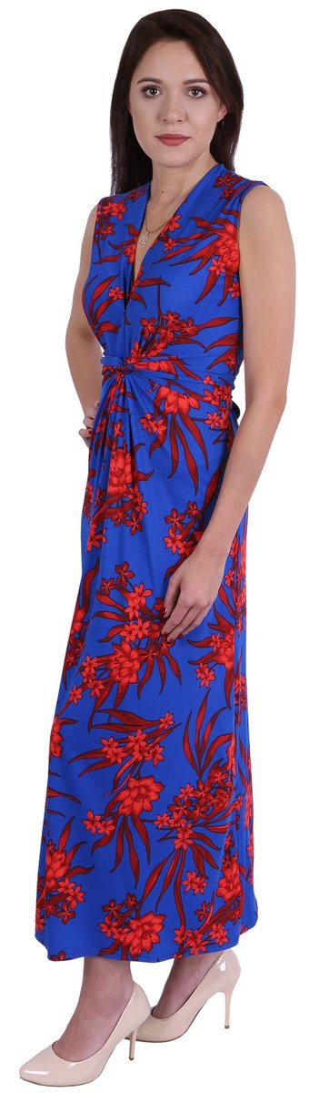 Niebieska sukienka maxi w czerwone kwiaty, bez rękawków.