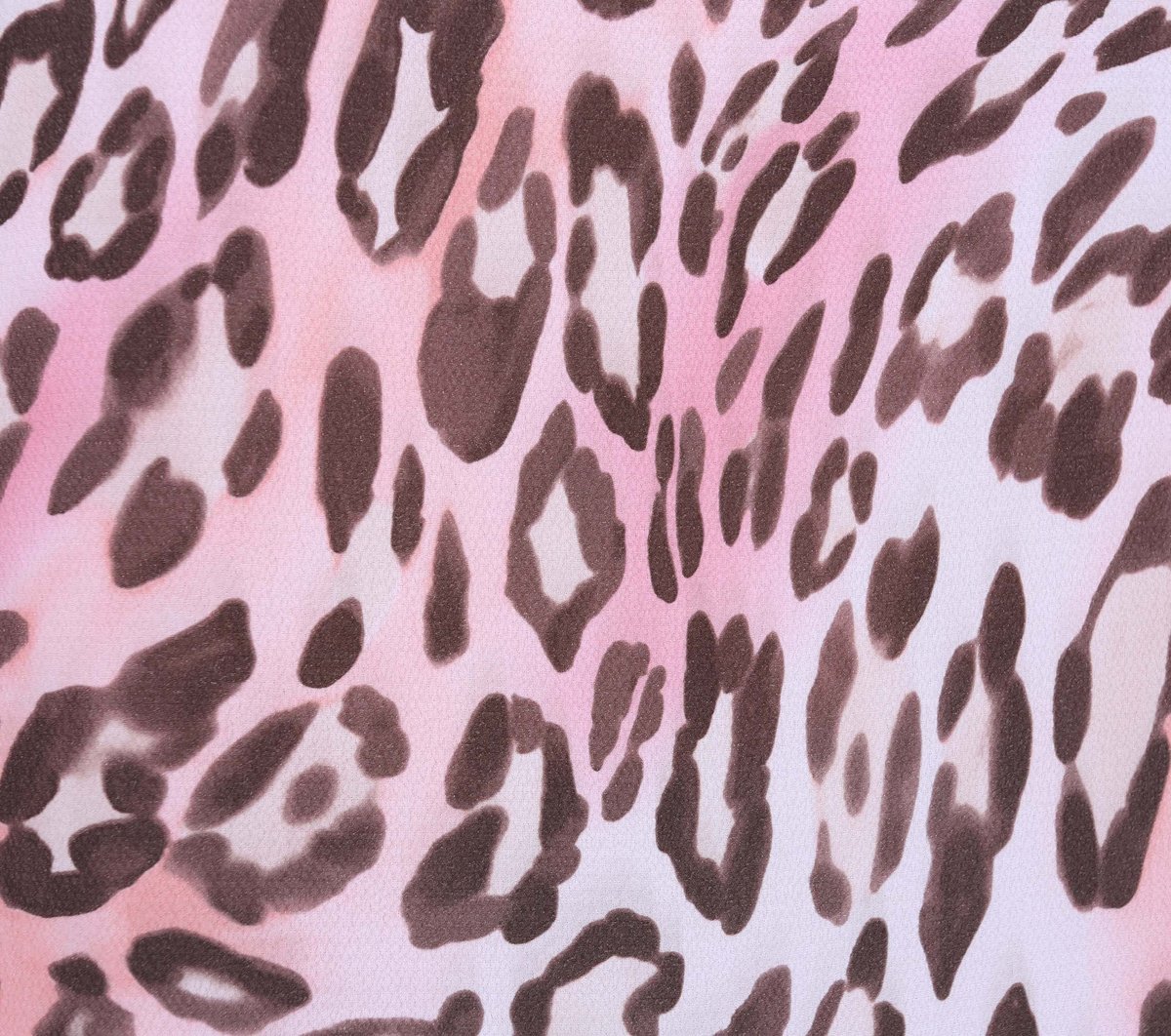 Krótka, różowa sukienka w brązowo-beżową panterkę.