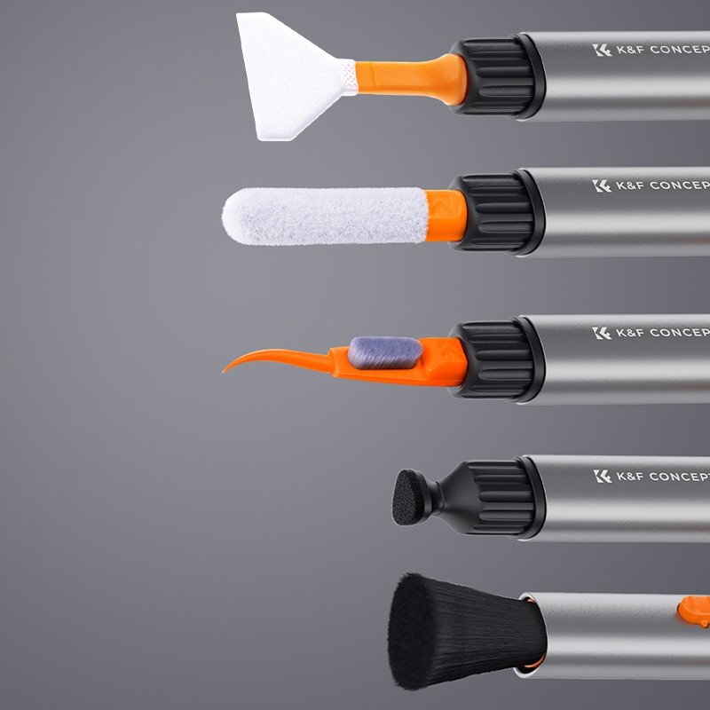 Poręczny zestaw przyborów czyszczących K&F Concept, dedykowany do aparatów z matrycą pełnoklatkową (full frame), obiektywów, filtrów fotograficznych, elementów optyki oraz drobnych przedmiotów codziennego użytku.