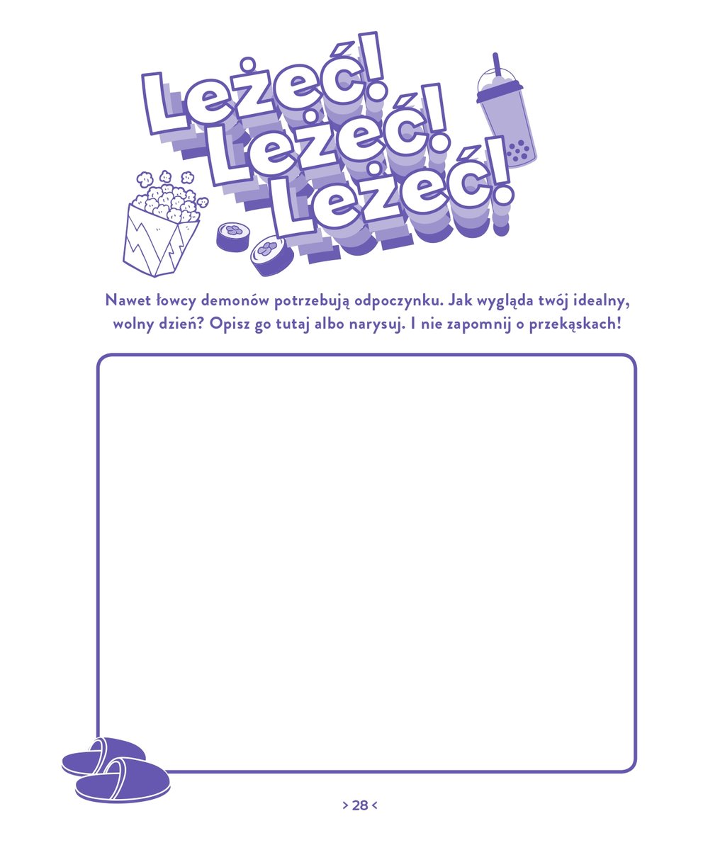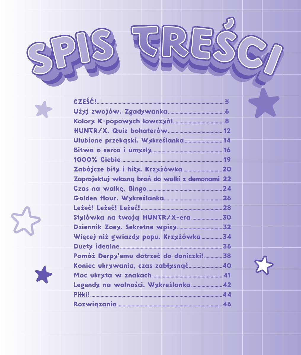"Nieoficjalna księga zadań" to interaktywny list miłosny do Huntrix. Będziesz rozwiązywać krzyżówki, wymiatać w wykreślankach (slay!), projektować kostiumy godne pogromców demonów, wyszukiwać ulubione teksty piosenek i testować swoją wiedzę o kluczowych momentach filmu.