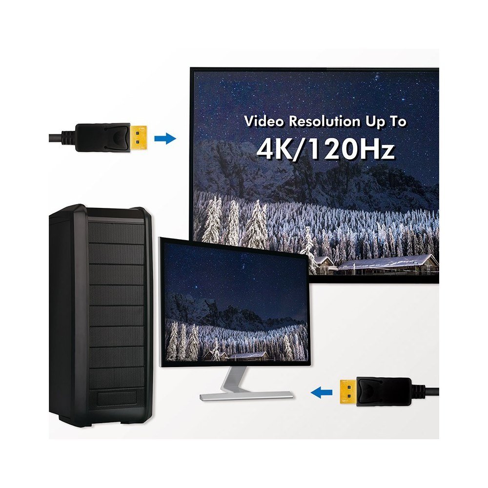 Kabel DP Techly ICOC DSP-A14-020NT wykonany został w standardzie DisplayPort 1.4 dzięki czemu pozwala on na osiągnięcie przepustowości na poziomie do 32,4Gbps. W praktyce oznacza to, że kabel DP 1.4 Techly może przesłać ze źródła sygnału do wyświetlacza obraz w rozdzielczości 4K przy częstotliwości odświeżania 120Hz (4K@120Hz) lub obraz w rozdzielczości 8K czy częstotliwości odświeżania 60Hz (8K@60Hz). Oferowana przez kabel DP 1.4 Techly profesjonalna wydajność sprawdzi się zarówno w warunkach domowych jak i przemysłowych.