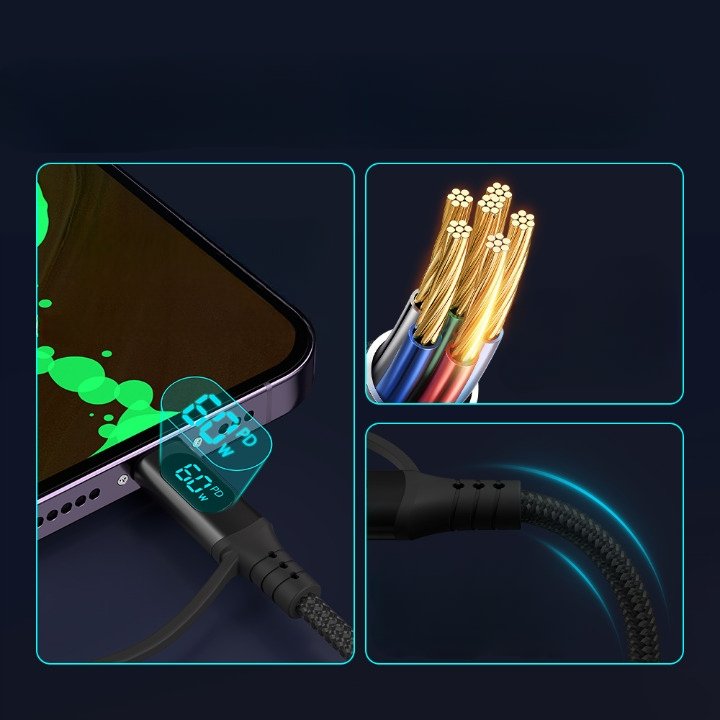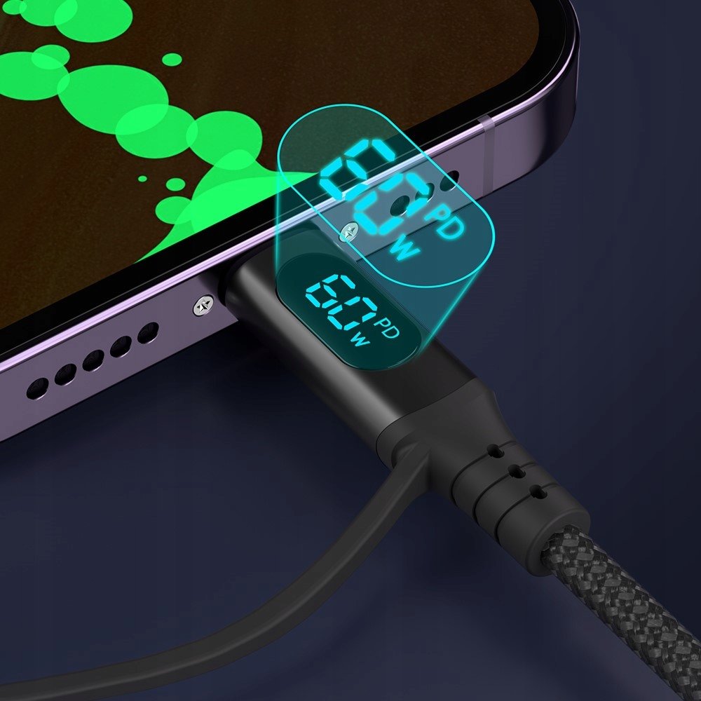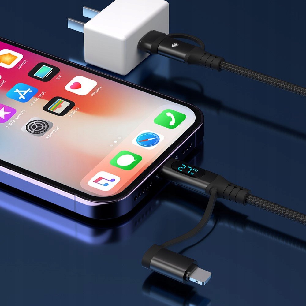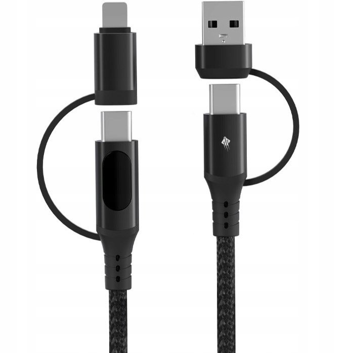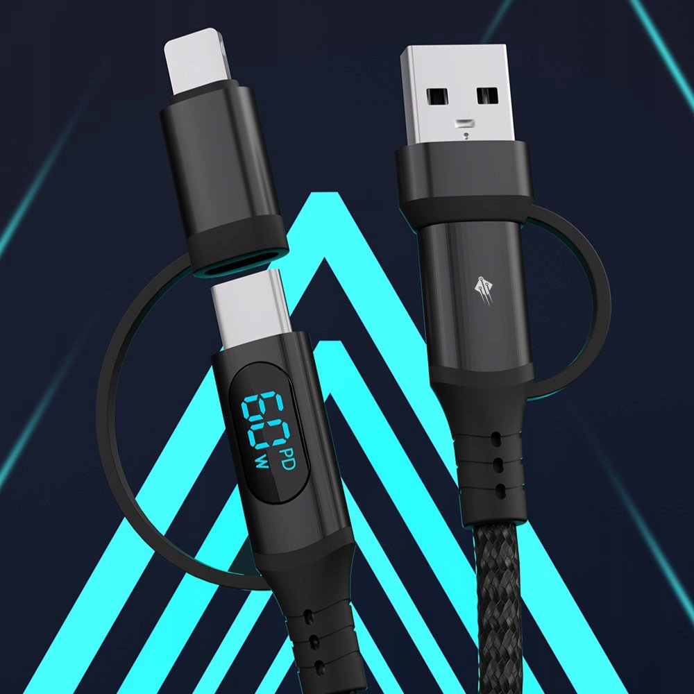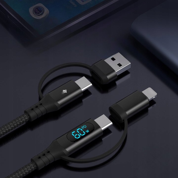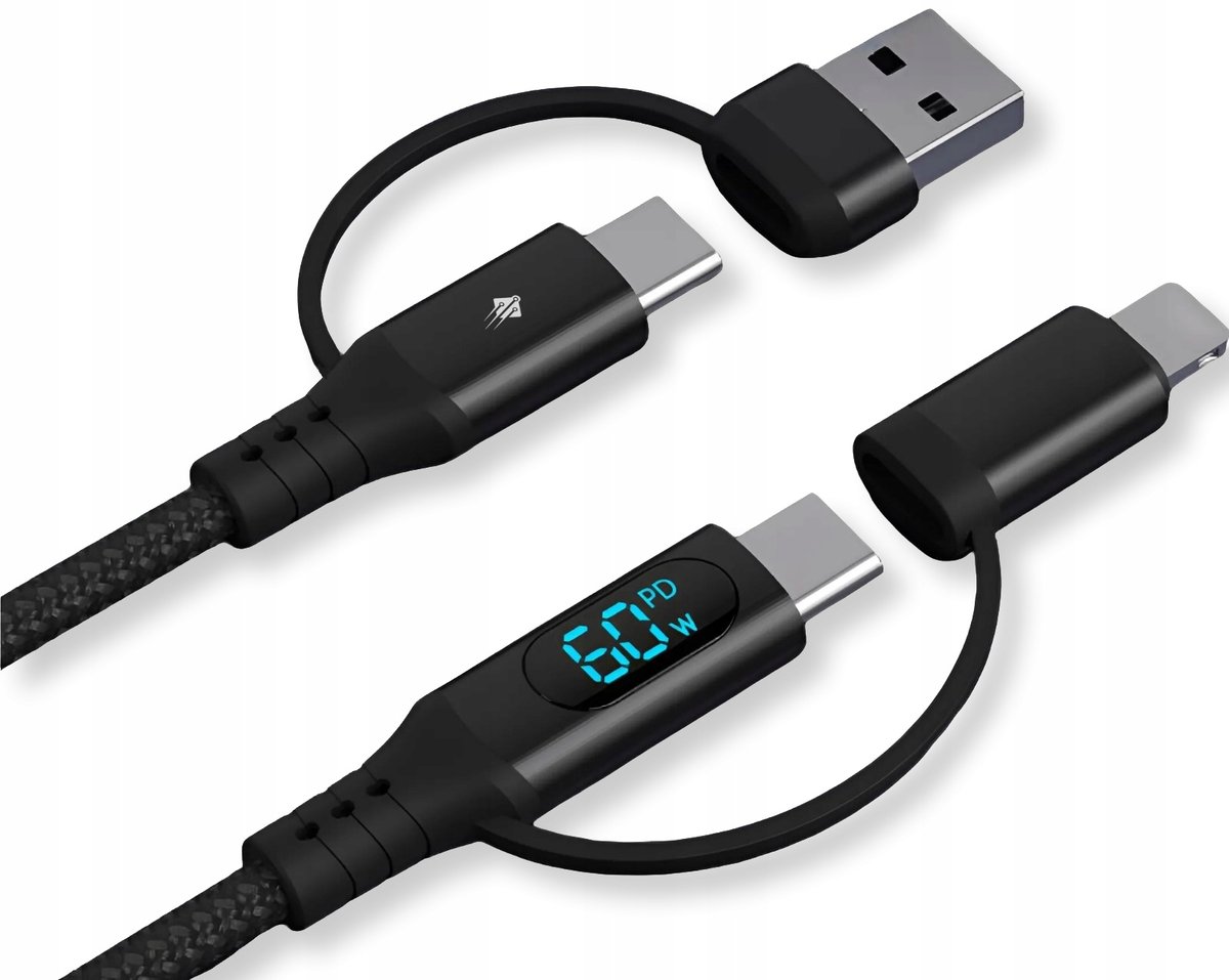 Kabel do ładowania i przesyłania danych 4w1 USB C + Lightning do USB-C + A, PD 60W z LCD 1m (100cm)