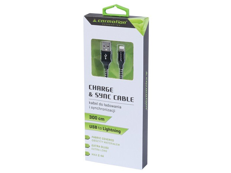 Kabel o długości 300 cm zakończony wtyczkami USB i Lightning. Może służyć zarówno do ładowania, jak i synchronizacji. Lightning jest marką handlową należącą do Apple Inc. Extra długi - długość: 300