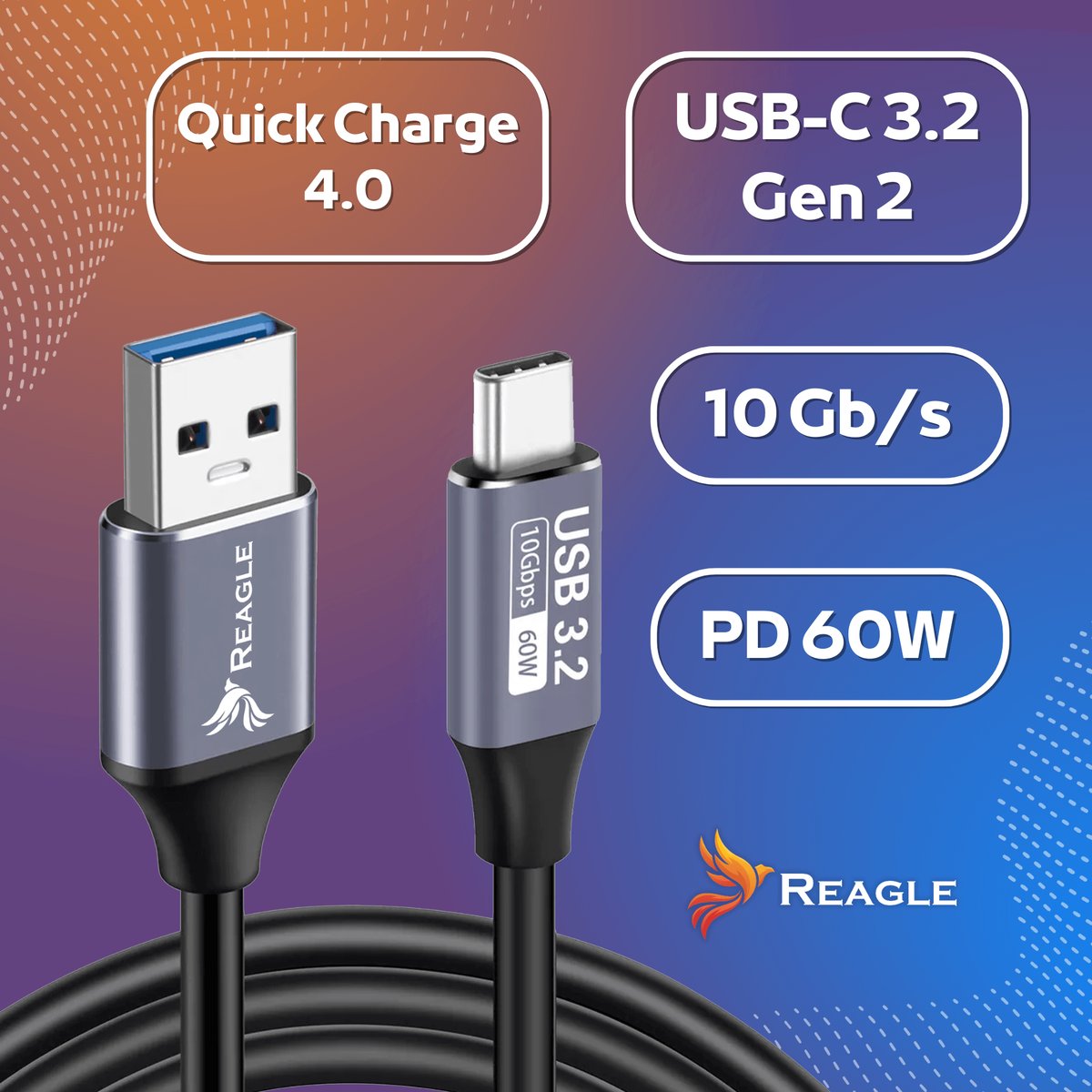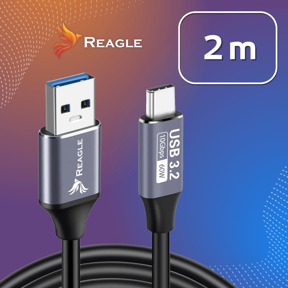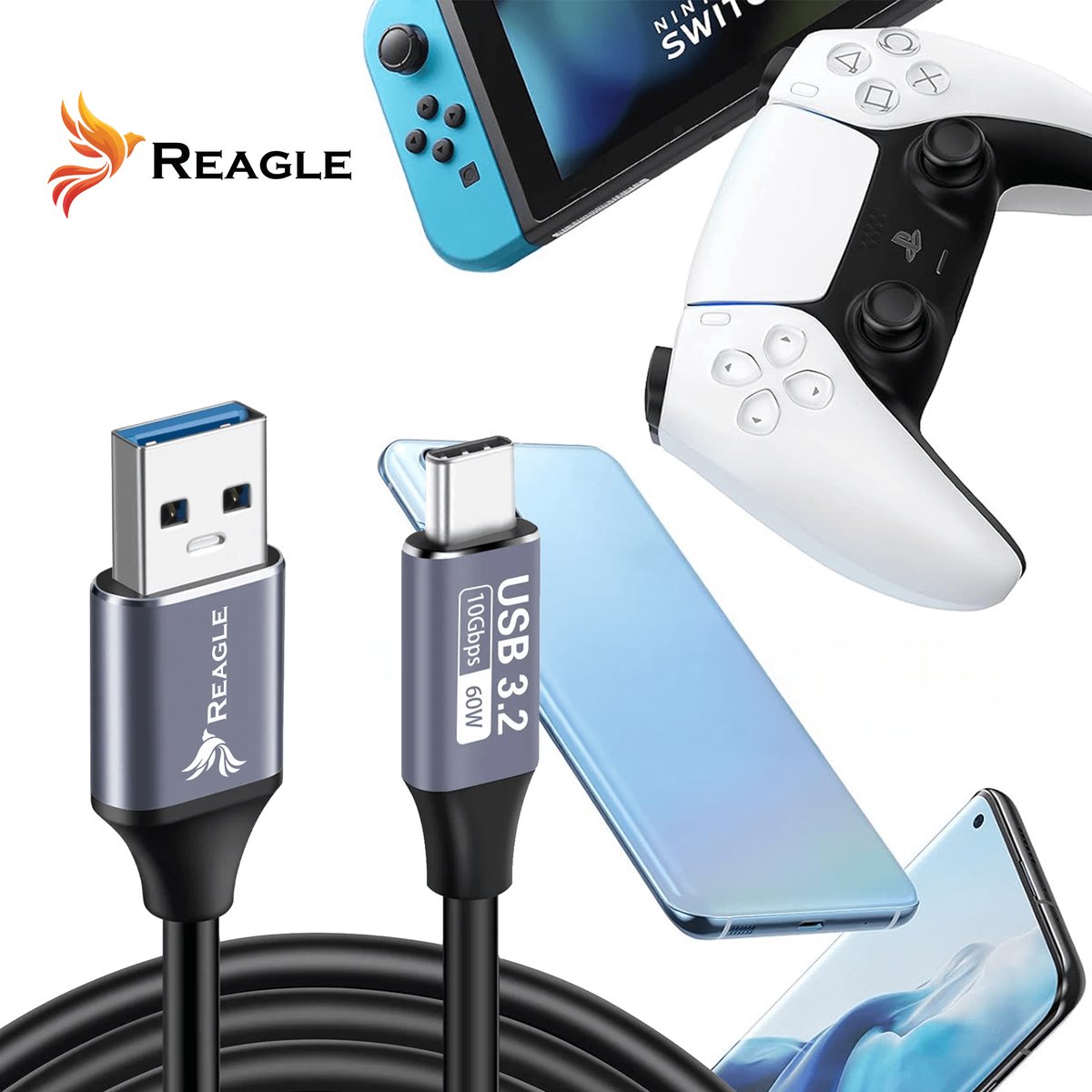 Dzięki technologii USB 3.2 Gen 2 kabel Reagle umożliwia przesył danych z prędkością do 10 gigabitów na sekundę.
