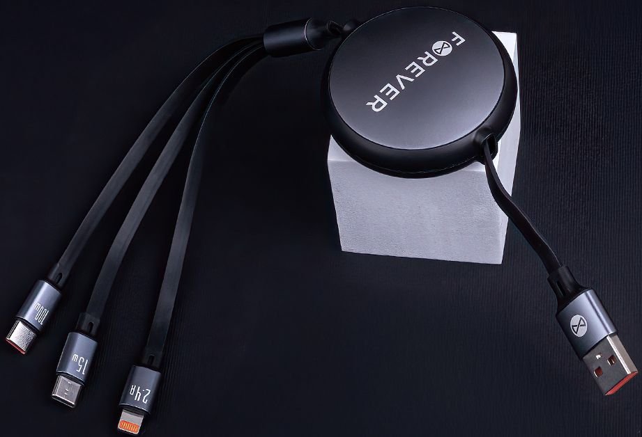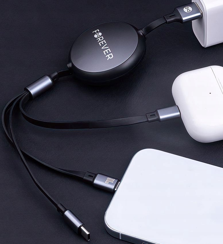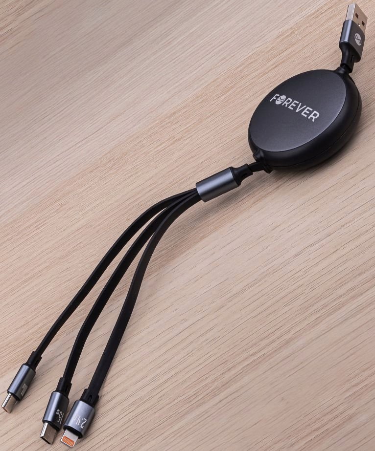 Uniwersalny kabel rozwijany USB marki Forever 3w1 ze złączem Lightning. Kabel posiada trzy złącza: 2 x USB typ-C oraz złącze 8-pin, dzięki czemu jednym kablem możesz ładować wiele różnych urządzeń z jednego źródła mocy. Duży amperaż (2.4 A) zapewnia funkcję szybkiego ładowania 'Fast Charge'.