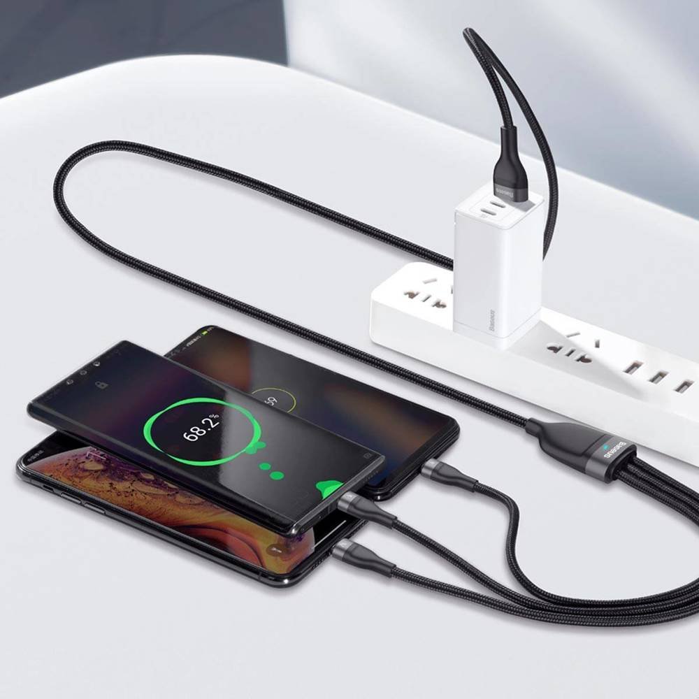 Ten wyjątkowy kabel firmy Baseus oferuje mnóstwo możliwości. Posiada trzy różne porty: Micro, Lightning i typu C. Wszystkie nadają się do szybkiego ładowania różnych telefonów. Całość zaoszczędzi sporo czasu i miejsca na biurku, w przeciwieństwie do trzech osobnych kabli. Jest zaskakująco łatwa do przechowywania, ale też nie sprawi problemu podczas transportu dzięki swojej poręczności. Dołączony stylowy pasek na rzep upraszcza zwijanie i utrzymanie porządku