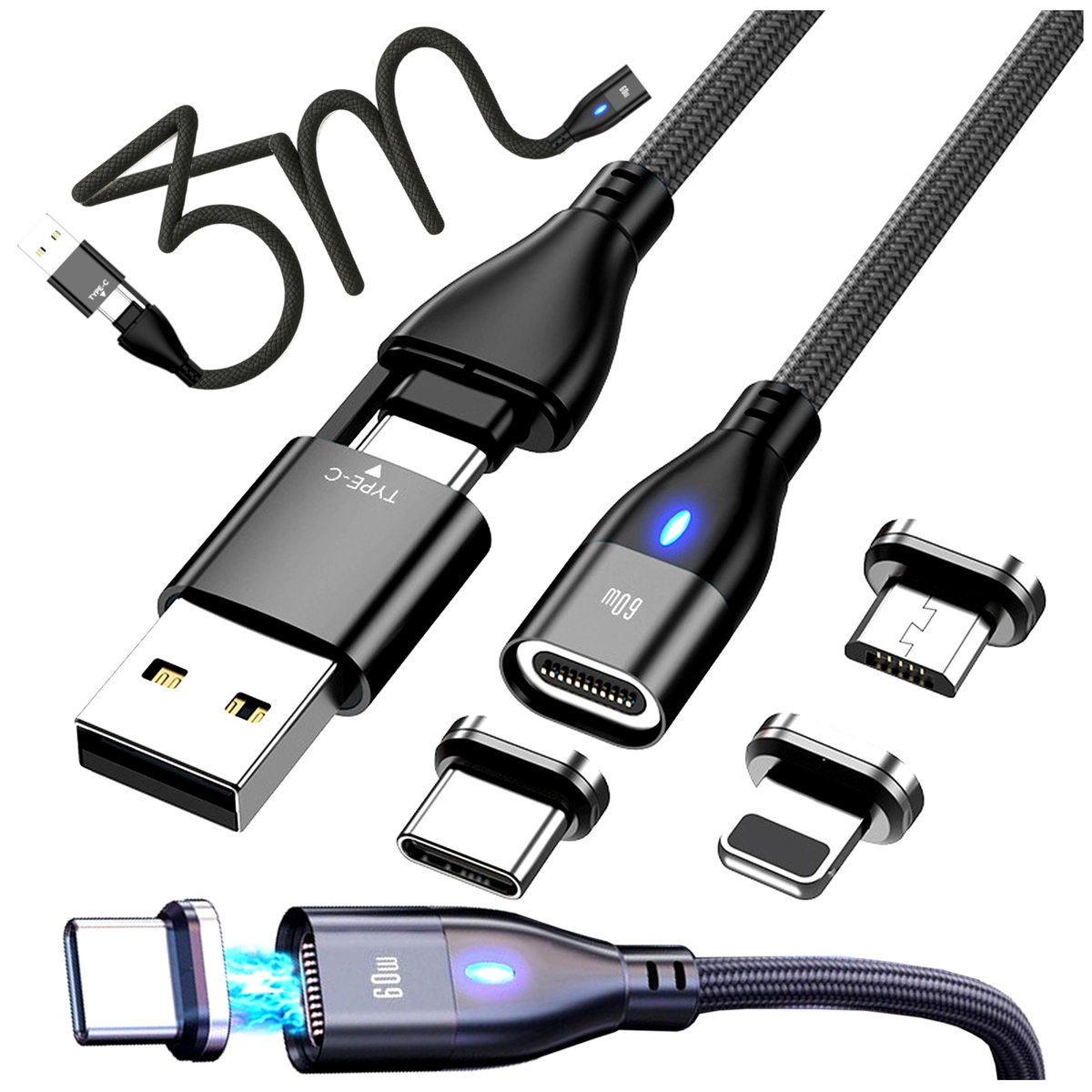 Kabel USB C USB-C Lightning micro-USB magnetyczny 3w2 szybkie ładowanie 3m ✴️Poznaj uniwersalny i niezawodny szybki kabel ...