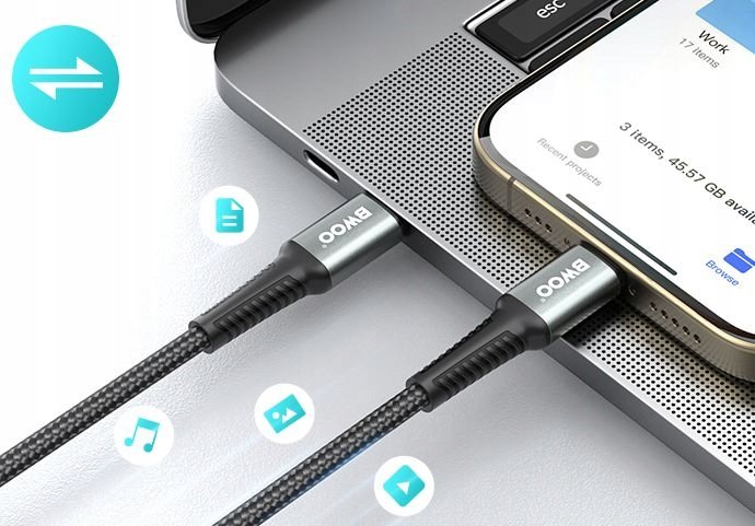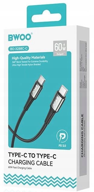 Kabel USB typ-C długości 3 metrów marki BWOO umożliwia połączenie tabletu, smartfonu lub nawigacji do ładowarki, komputera w celu ładowania lub transmisji danych. Kabel jest kompatybilny z ładowarkami pracującymi w technologii Quick Charge, co pozwala na znacznie szybsze niż standardowe naładowanie telefonu. Wysokie, maksymalne natężenie prądu (maks. moc 60W) wspiera proces ładowania.