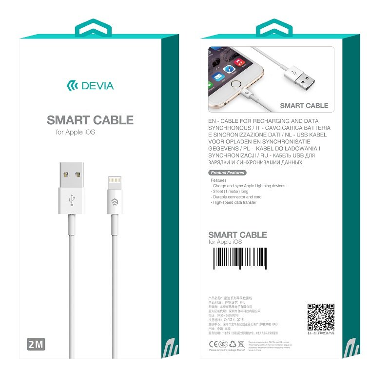 Uniwersalny kabel Devia Smart służący do połączenia smartfonów z ładowarką lub komputerem. Przystosowany do ładowania baterii oraz transferu danych w urządzeniach wyposażonych w gniazdo 8-pin.