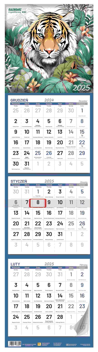 Kalendarz ścienny - trzymiesięczny z okienkiem i wypukłą główką w dwóch różnych wzorach graficznych (kwiaty, tygrys). Wymiary: 200x775 mm, papier: offset 70 g/m2, okładka: karton 250 g/m2Uwaga:mix ...