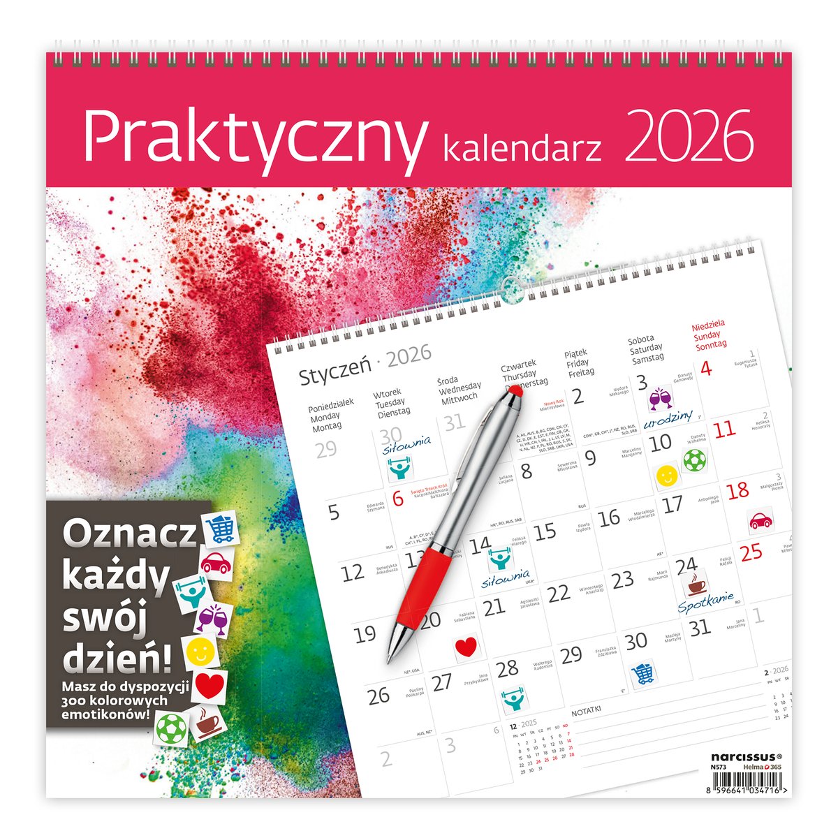 Kalendarz 2026 Praktyczny 30x30 z naklejkami Kalendarz ścienny z naklejkami ułatwiającymi organizację zajęć i planów. Naklejek jest aż 300 i są one na ostatniej, dodatkowej karcie kalendarza. Tematów