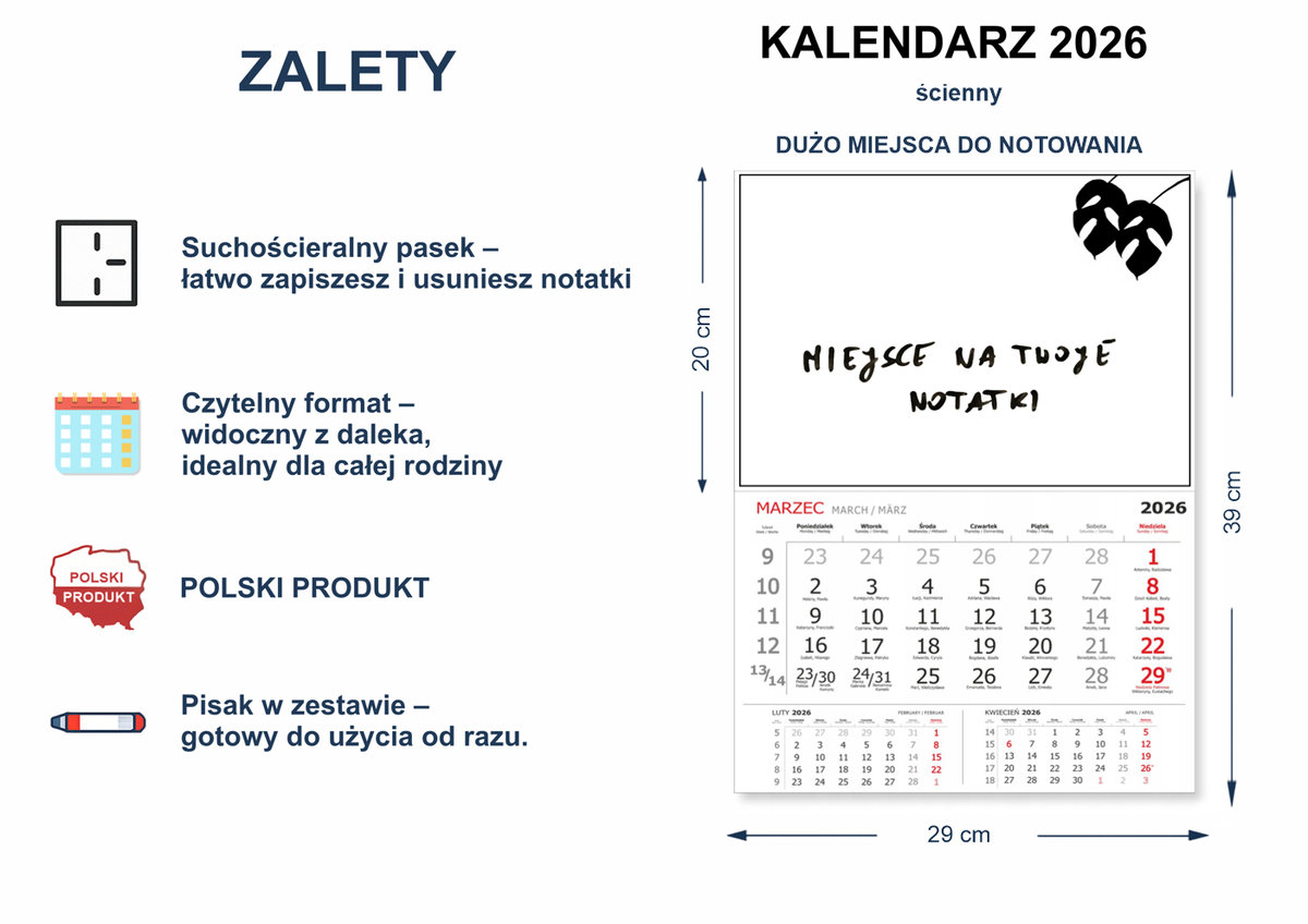 KALENDARZ ŚCIENNY 2026 – TABLICA SUCHOŚCIERALNA Z MIEJSCEM NA NOTATKI